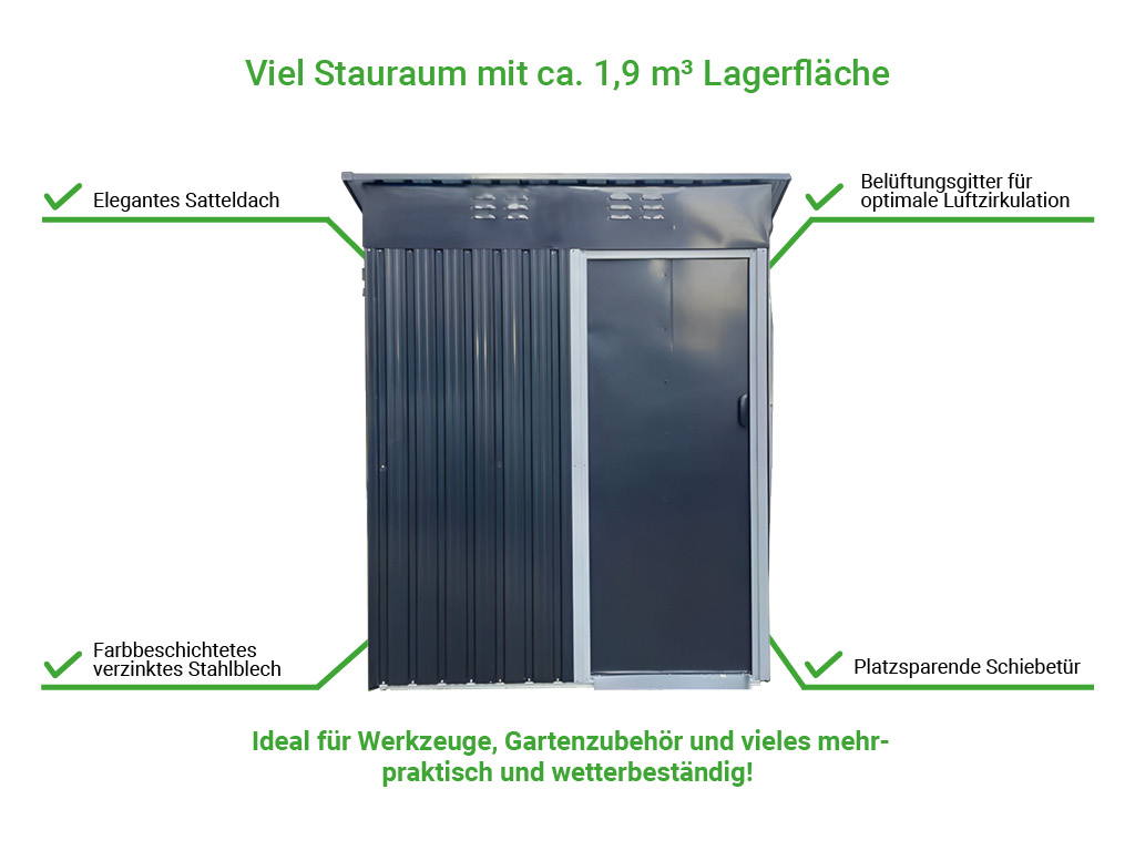 La surface au sol de l’abri de jardin est d’environ 1,1 m². Une utilisation optimale de l’espace est garantie grâce à une hauteur du faîtage de 184 cm.