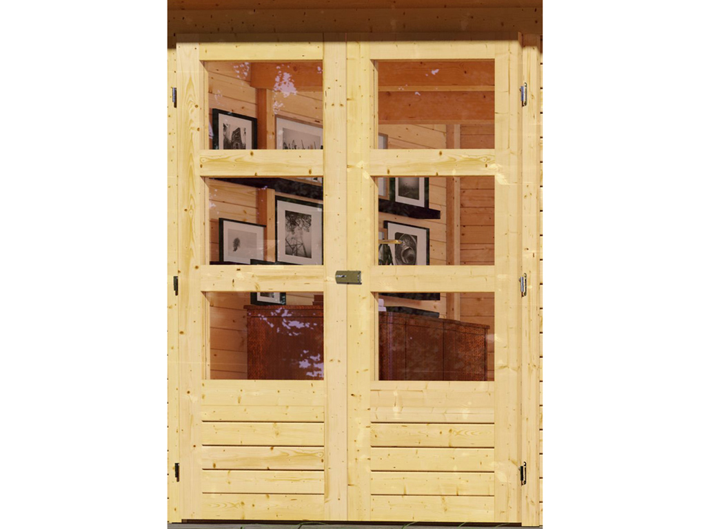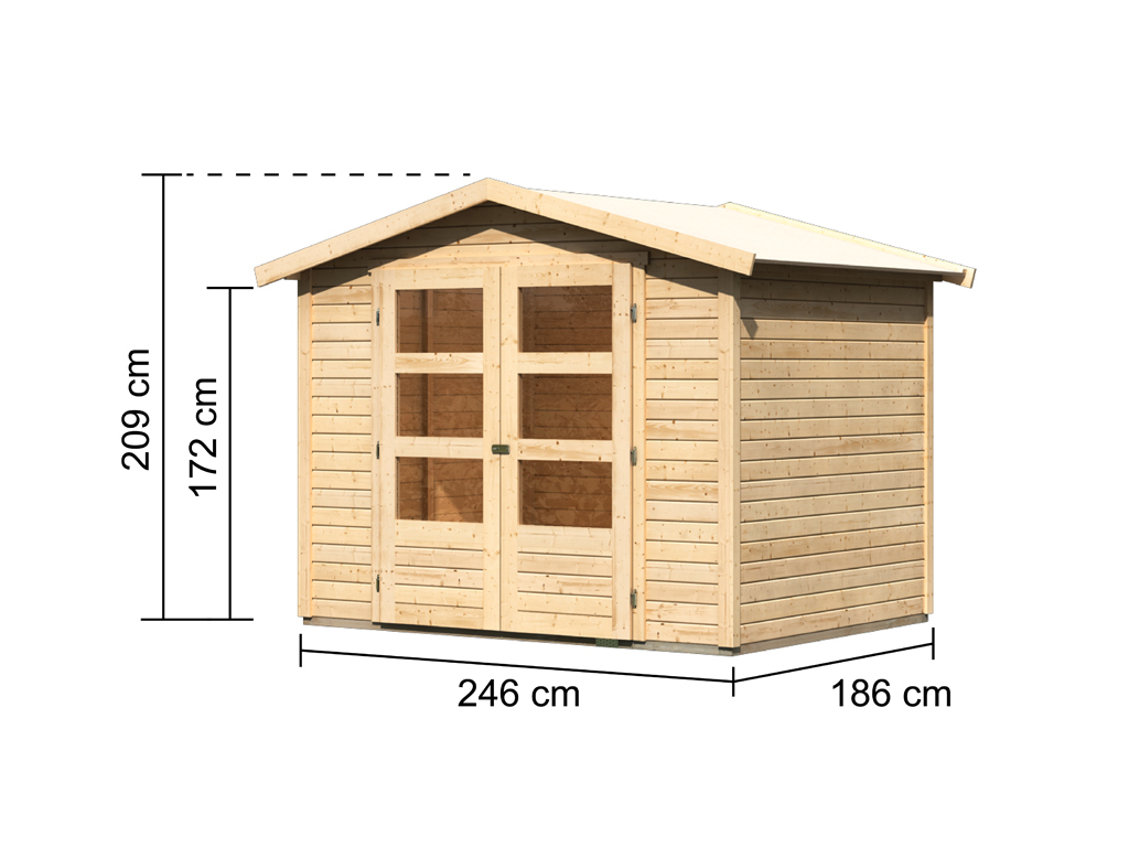 L x P x H: 246 x 186 x 209 cm, Dimensions du socle de la maison: L x P: 242 x 182 cm, y compris Porte à double battant avec découpes vitrées