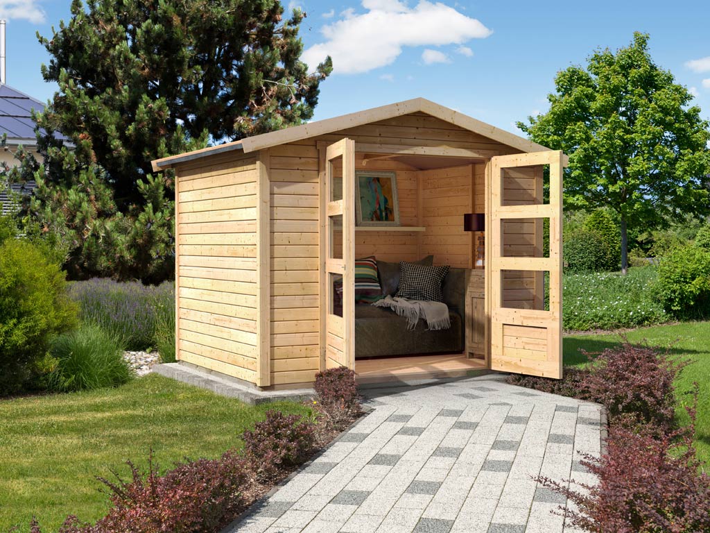 Un abri de jardin avec système de construction est une alternative avantageuse à la construction en rondins. Dans ce type de construction également, des profilés en bois déjà préfabriqués sont emboîtés les uns sur les autres par un assemblage à rainure et languette. Contrairement à la construction en rondins, la construction modulaire ne comporte pas d'encoches à la tête de l'abri de jardin. Au lieu de cela, les rondins sont maintenus ensemble par un cadre en bois intérieur. Les coins sont cachés par des moulures placées de chant. Cela rend le montage et le démontage particulièrement faciles et simples. Il est également avantageux de pouvoir installer des fenêtres et des portes ultérieurement.