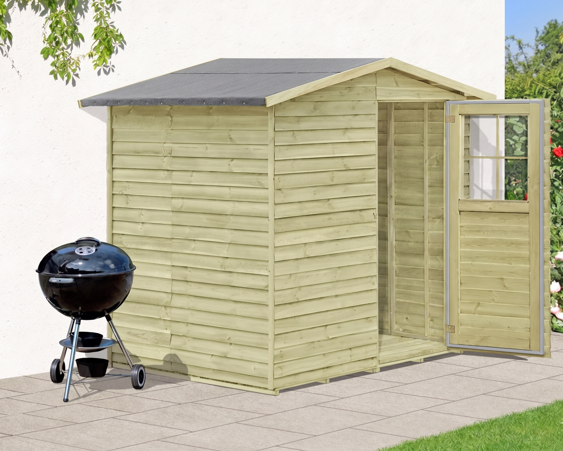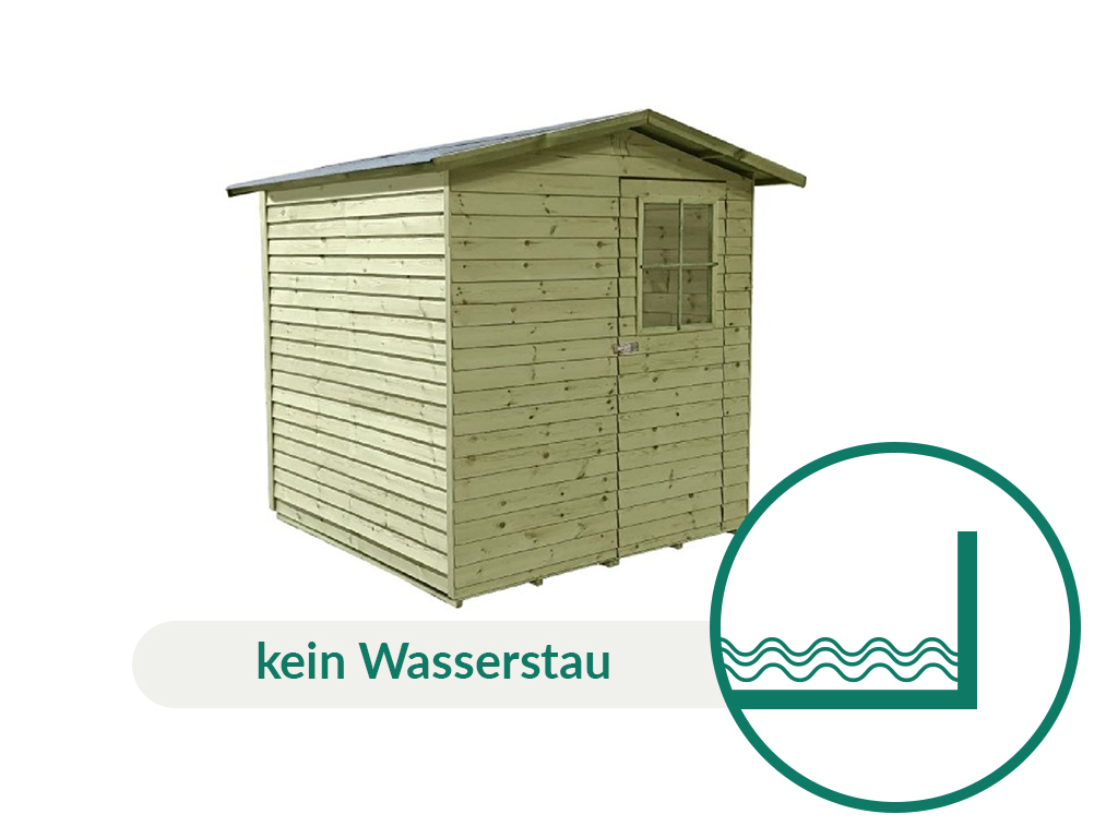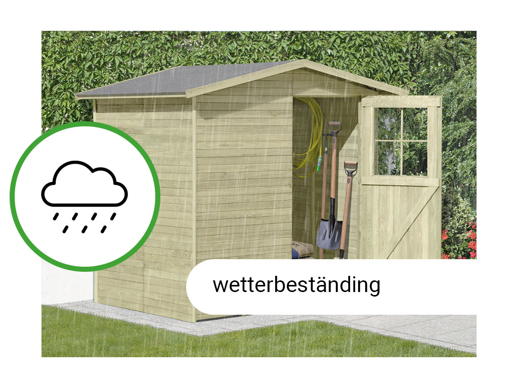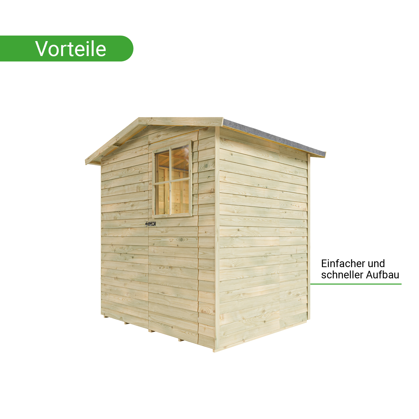 Les éléments de paroi prémontés sont livrés en coffrage à clin. Les planches de bois placées horizontalement, où chaque planche supérieure recouvre de quelques centimètres la planche située en dessous, offrent une protection particulière contre les intempéries. Les lamelles mesurent L 9 mm x P 110 mm et sont sciées proprement. Le plancher et le toit en bois profilé livrés avec l'abri sont également entièrement montés et ont une épaisseur de 14 mm. - Porte simple avec découpe vitrée