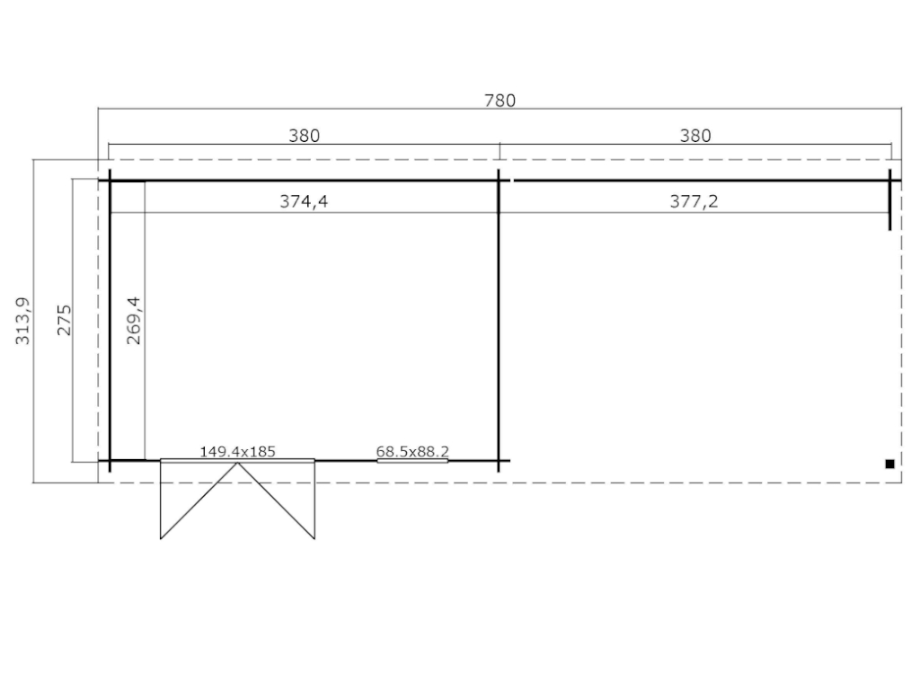L x P x H: 780 x 314 x 211 cm, Dimensions du socle de l'abri L x P: 370 x 275 cm, auvent de 380 cm inclus+ fenêtre