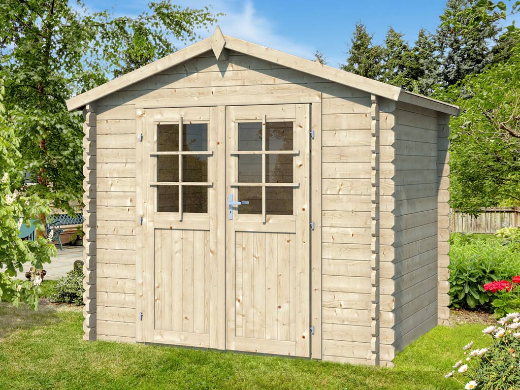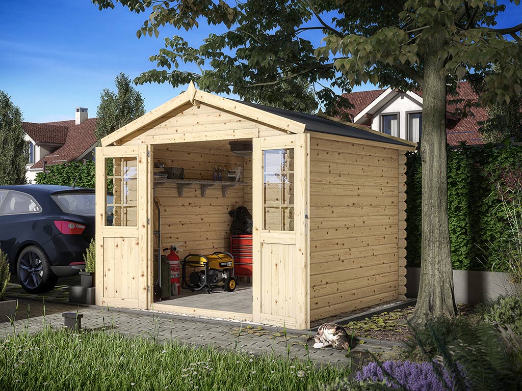 En tant que classique parmi les abris de jardin, un abri de jardin en madriers dispose d'une construction très robuste, associée à une esthétique particulière et naturelle. La construction en madriers s'inspire de la cabane en bois traditionnelle. Les murs sont constitués de planches de bois préfabriquées (madriers) qui s'emboîtent facilement les unes dans les autres grâce à un assemblage à rainure et languette. Cela garantit un montage et un démontage simples et rapides. Les encoches sur l'extrémité des madriers ne donnent pas seulement un bel aspect aux angles de l'abri, mais maintiennent également l'ensemble de la construction et la rendent particulièrement résistante au vent et aux intempéries.