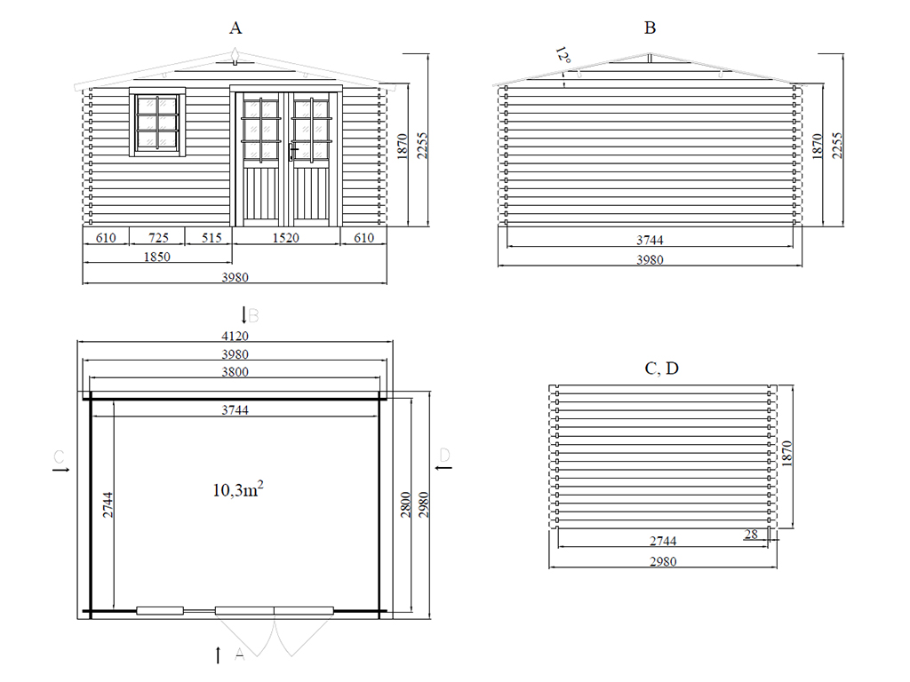 La surface au sol de l'abri de jardin est de 10,3 m² avec une dimension de socle de 377,2 x 277,2 cm (l x p). Une utilisation optimale de l'espace est garantie par une hauteur de faîtage de 225,5 cm.