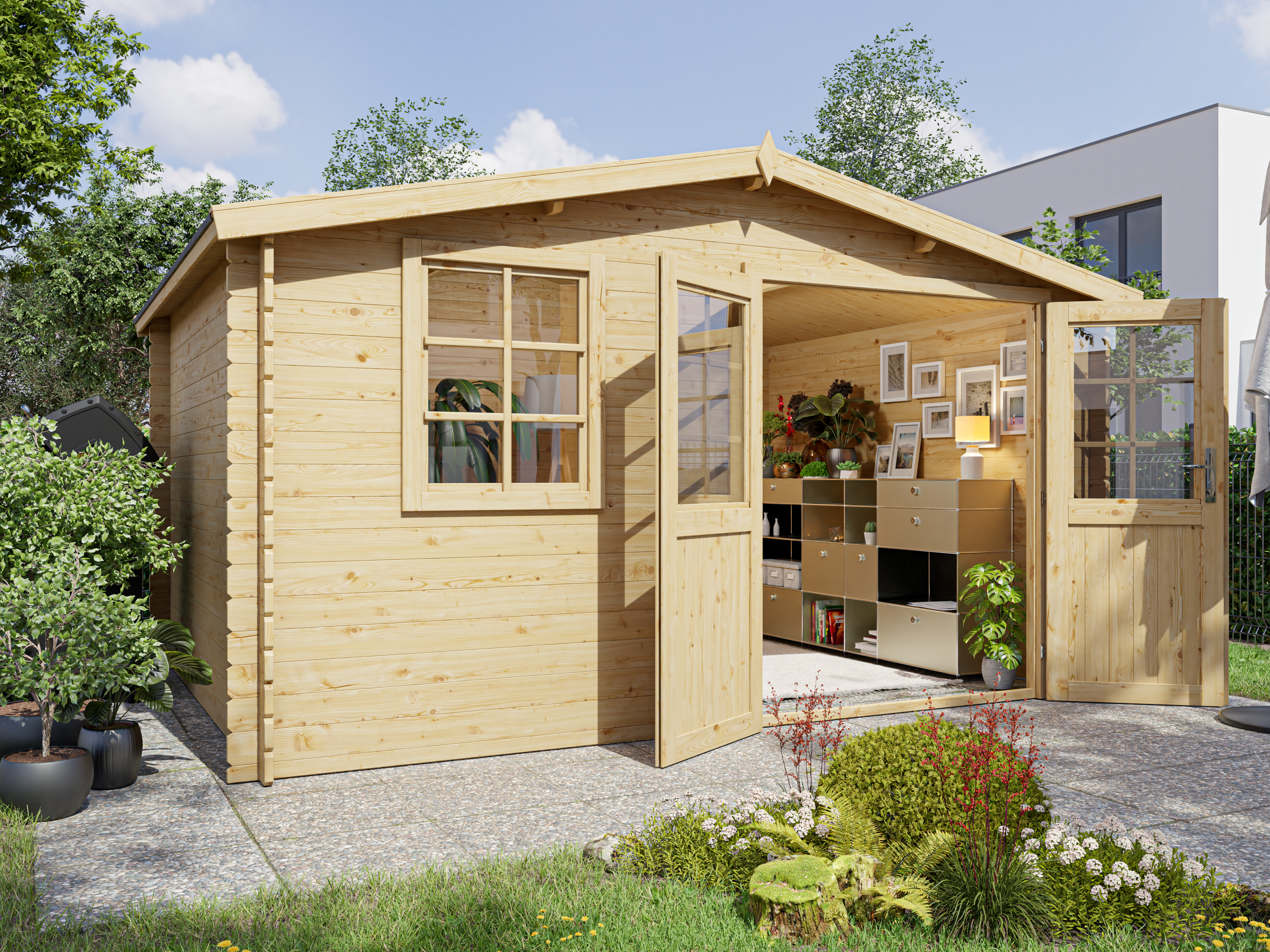 En tant que classique parmi les abris de jardin, un abri de jardin en madriers est une construction très robuste, associée à une esthétique particulière et naturelle. La construction en madriers s'inspire de la cabane en bois traditionnelle. Les murs sont constitués de planches de bois (madriers) préfabriquées qui s'emboîtent facilement les uns dans les autres grâce à un assemblage à rainure et languette. Cela garantit un montage et un démontage simples et rapides.Les encoches sur l'extrémité des madriers ne donnent pas seulement un bel aspect aux angles de l'abri, mais maintiennent également l'ensemble de la construction et la rendent particulièrement résistante au vent et aux intempéries.