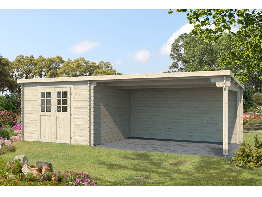 Abri de jardin en bois CA2978 28 mm naturel avec auvent de 4 m