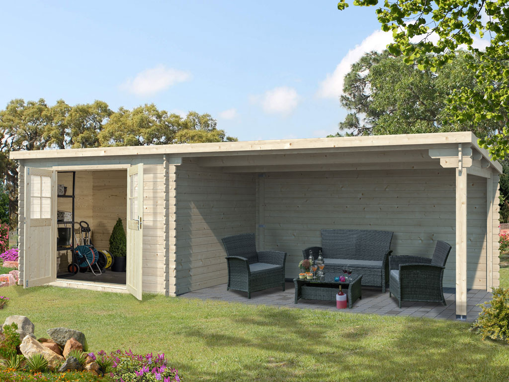 Abri de jardin en bois CA2978 28 mm naturel avec auvent de 4 m