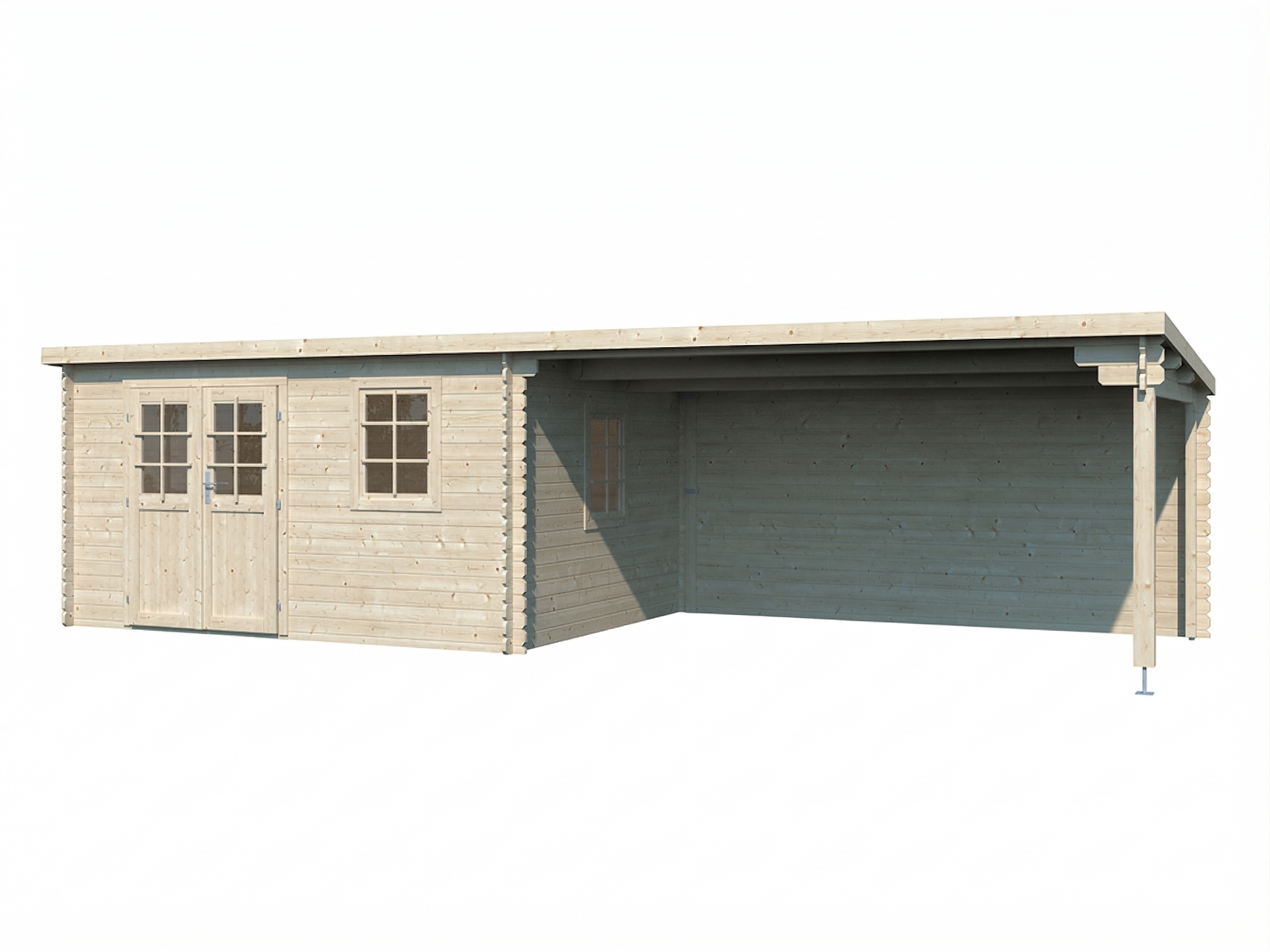 Abri en madriers de 28 mm d'épaisseur avec une large porte à double battant avec découpes vitrées en verre véritable et auvent.
