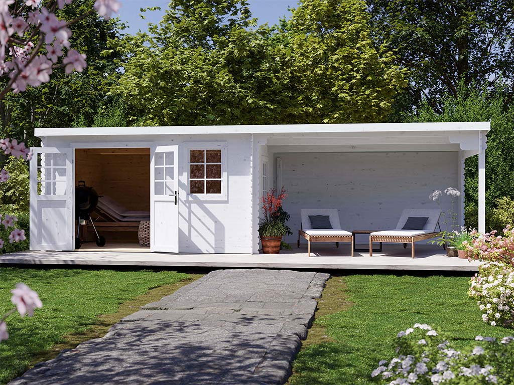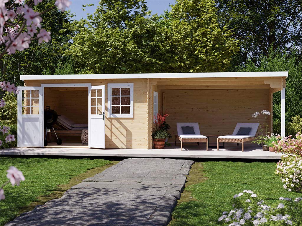 Abri de jardin en bois CA2988 28 mm naturel avec auvent de 4 m