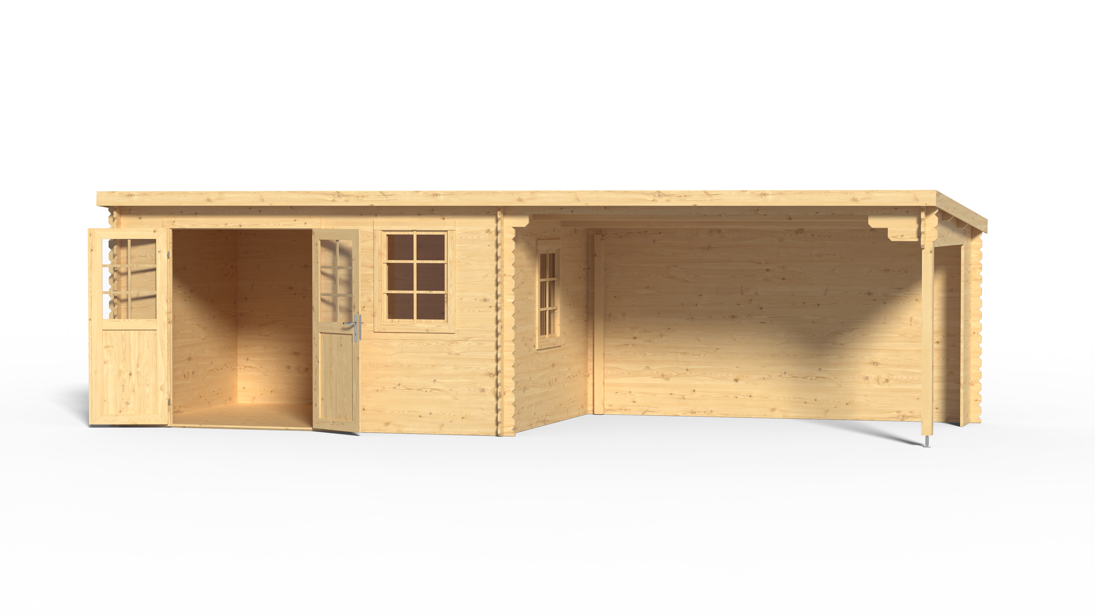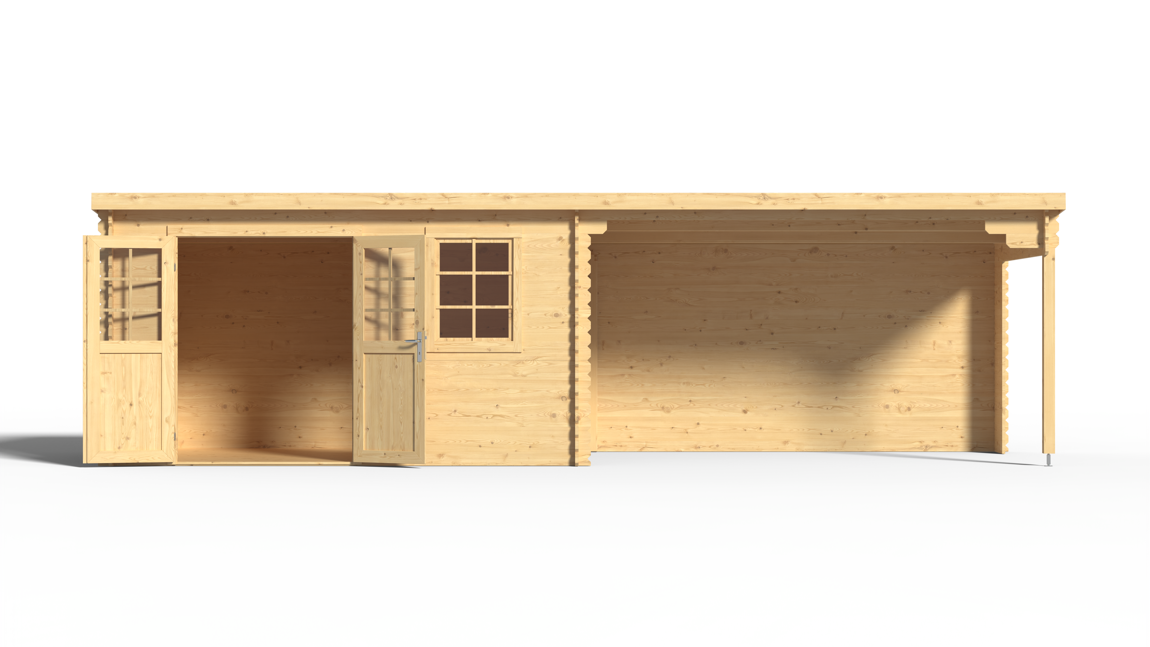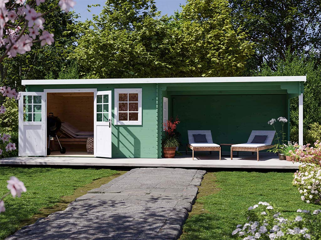 Abri en madriers de 28 mm d'épaisseur avec une large porte à double battant avec découpes vitrées en verre véritable et auvent.