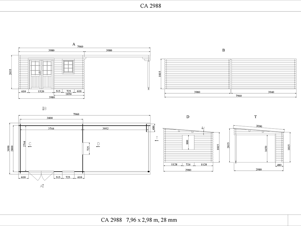 | Dimensions extérieures avec débord de toit (l x P): | 796 x 309 cm |