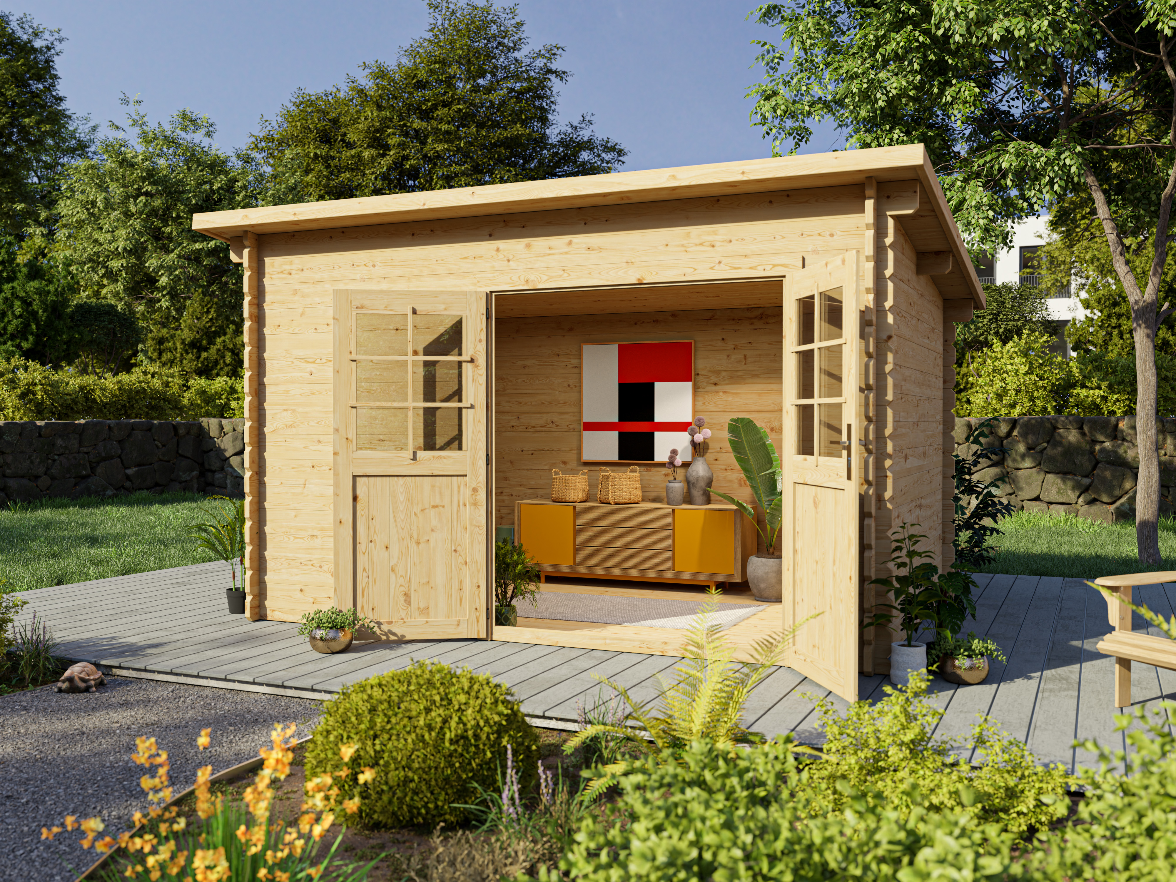 L'abri de jardin est dotée d'un toit monopente moderne et élégant. - Porte moderne avec de nombreuses découpes vitrées pour plus de lumière