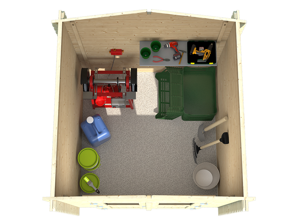 - L’abri de jardin est livré sans plancher. Vous trouverez un colis de plancher adapté dans notre assortiment d’accessoires. Le kit de montage de cet abri de jardin est constitué de 2 colis de 1,5 m².