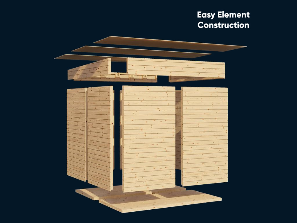 - Toutes les pièces sont complètement préfabriquées - aucun sciage ou vissage des planches murales individuelles requis.