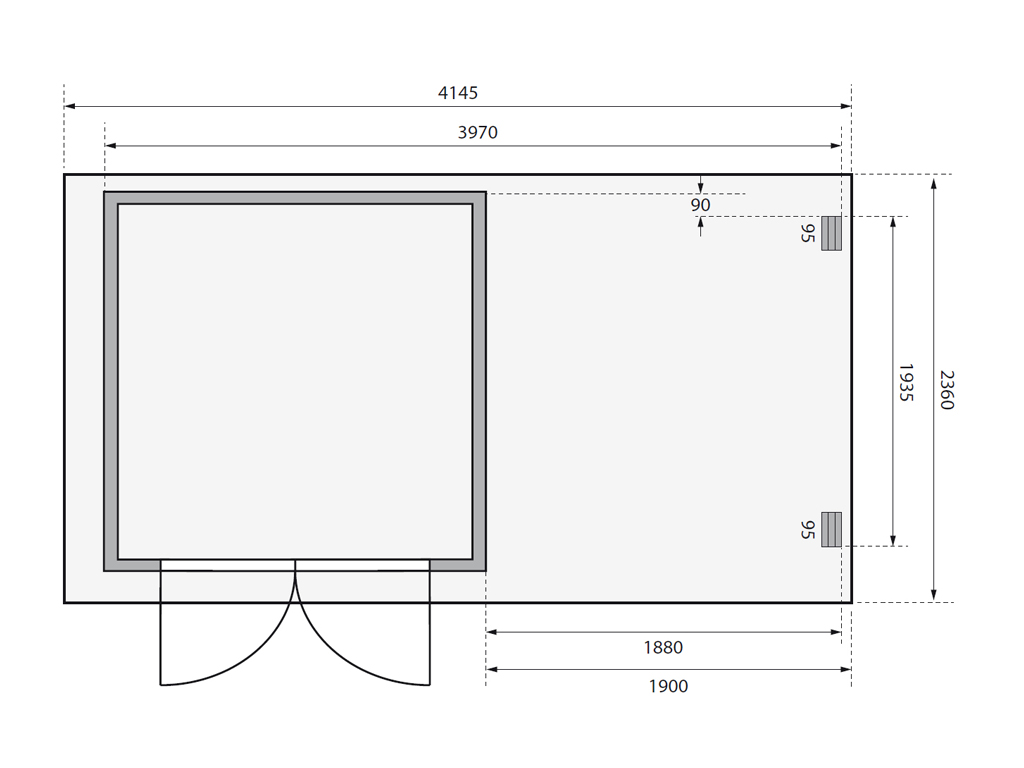 | Dimensions extérieures avec débord de toit (l x P): | 415 x 236 cm |
