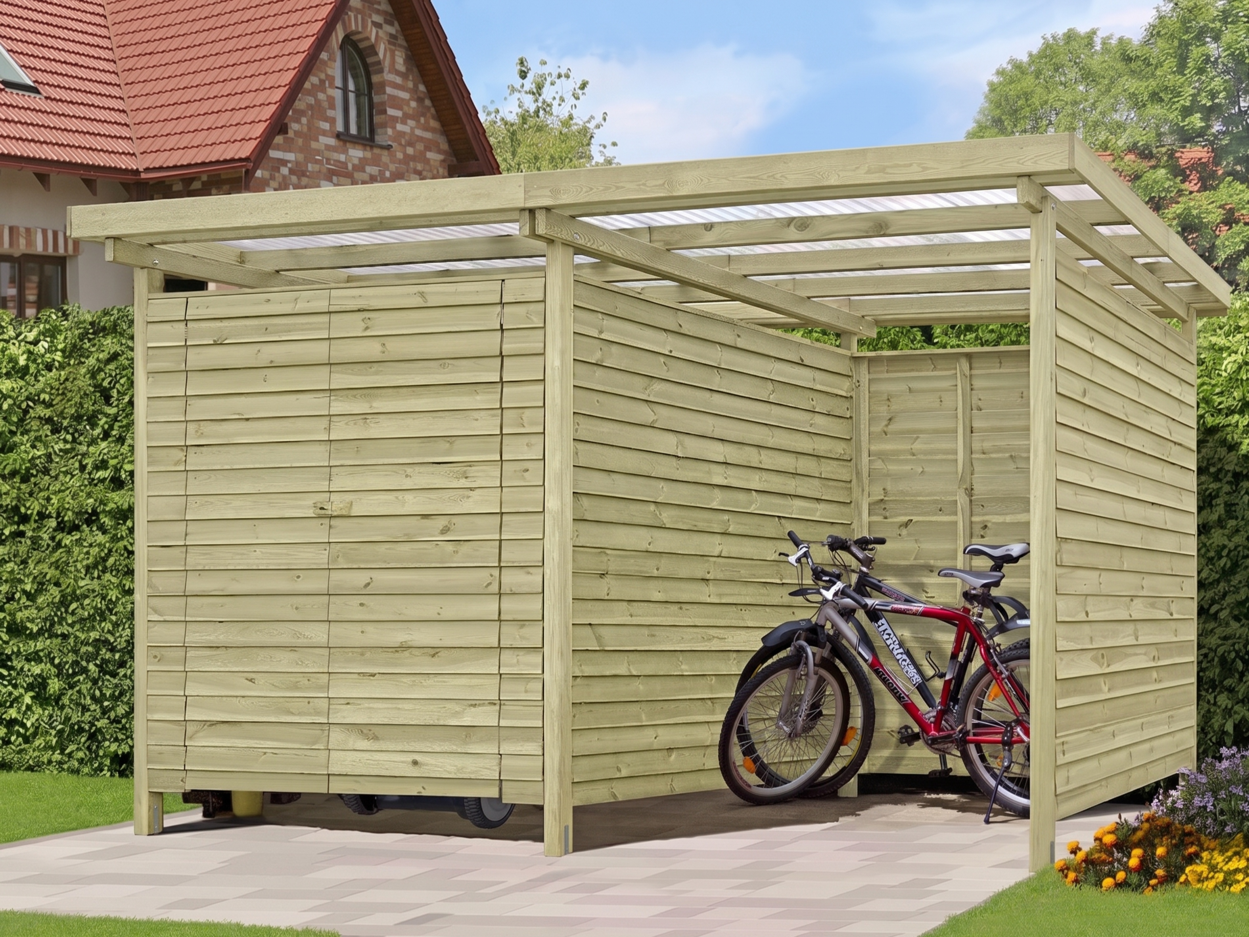 Les éléments de paroi prémontés sont livrés en coffrage à clin. Les planches de bois placées horizontalement, où chaque planche supérieure recouvre de quelques centimètres la planche située en dessous, offrent une protection particulière contre les intempéries. Les lamelles mesurent L 9 mm x P 110 mm et sont sciées proprement. Le toit est recouvert de plaques de toit transparentes en PVC en forme de vagues. Les poteaux robustes en bois croisé ont une épaisseur de 7 x 7 cm. - Double porte en bois massif