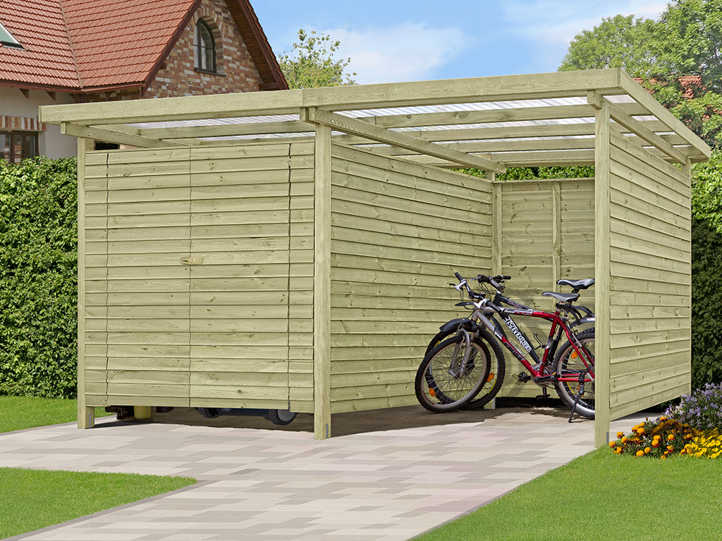 Les éléments de paroi prémontés sont livrés en coffrage à clin. Les planches de bois placées horizontalement, où chaque planche supérieure recouvre de quelques centimètres la planche située en dessous, offrent une protection particulière contre les intempéries. Les lamelles mesurent L 9 mm x P 110 mm et sont sciées proprement. Le toit est recouvert de plaques de toit transparentes en PVC en forme de vagues. Les poteaux robustes en bois croisé ont une épaisseur de 7 x 7 cm. - Double porte en bois massif