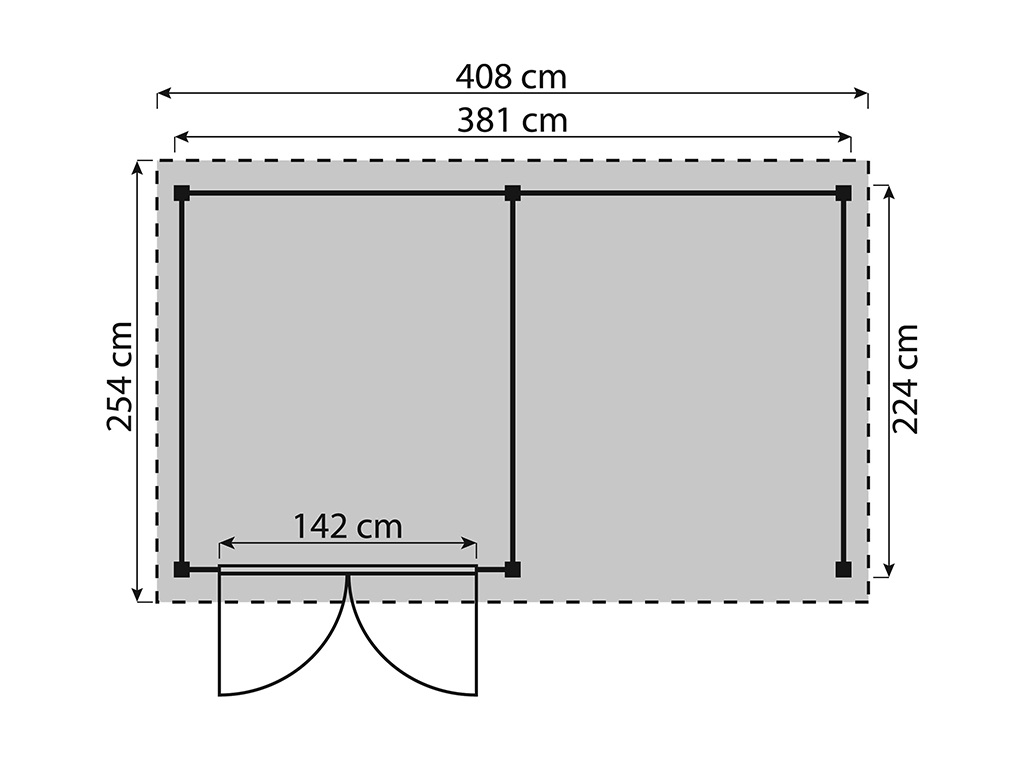 | Dimensions extérieures avec débord de toit (l x P): | 408 x 254 cm |
