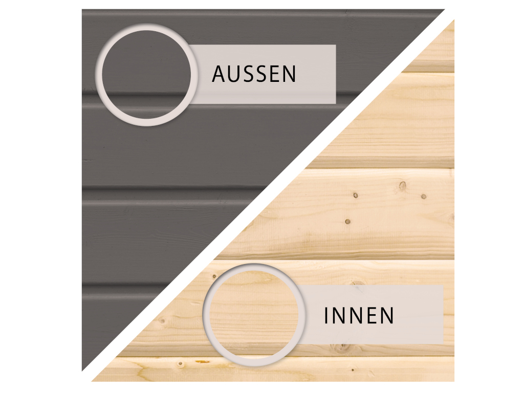 Le plancher de 19 mm d'épaisseur pour l'intérieur est déjà compris dans la livraison. Un plancher de 18 mm d'épaisseur en planches imprégnées en autoclave est également fourni pour la terrasse couverte. La sous-construction en bois imprégné en autoclave, également fournie, protège de l'humidité par le bas.