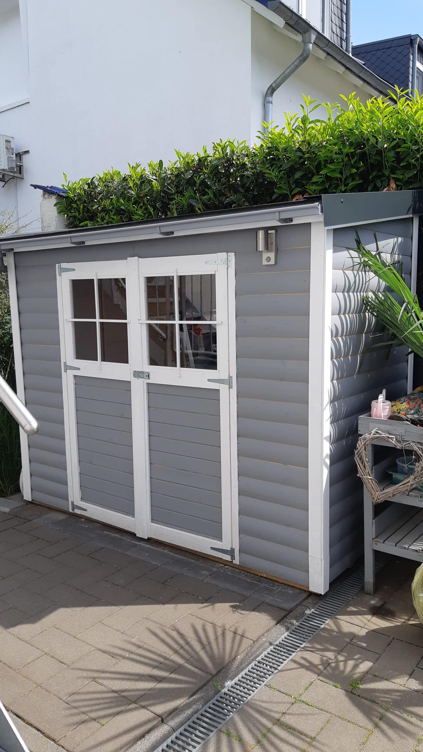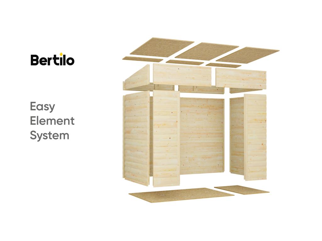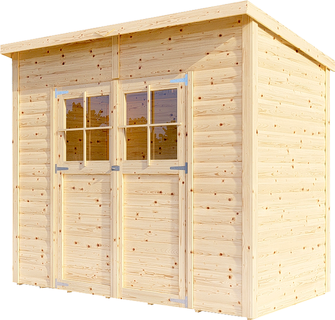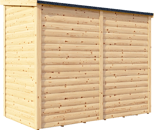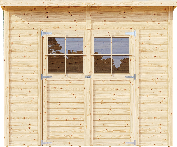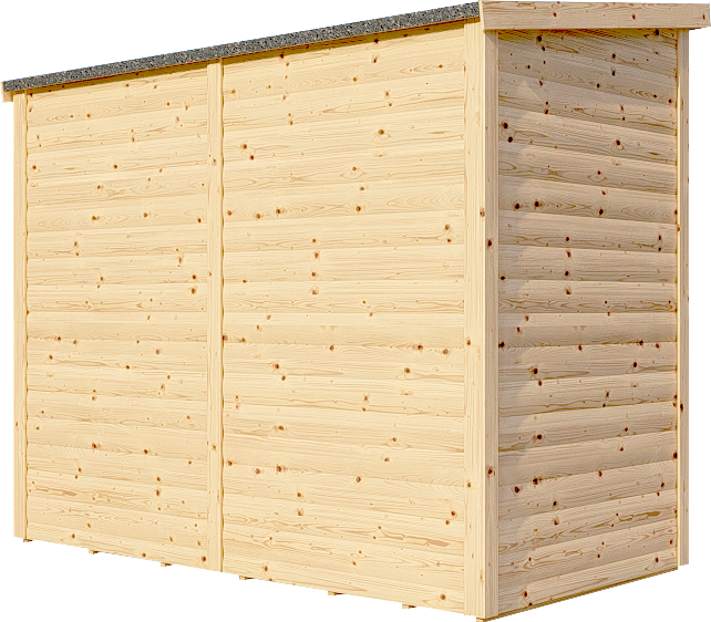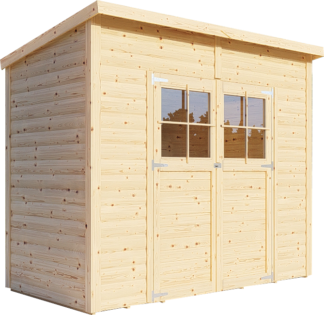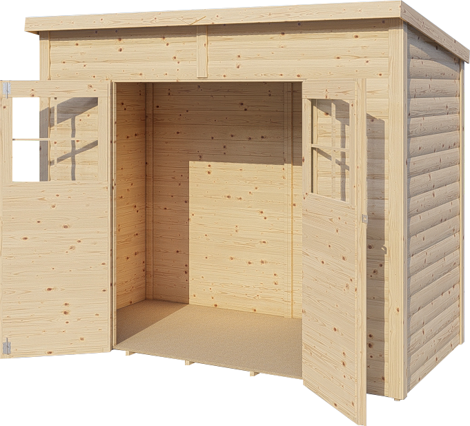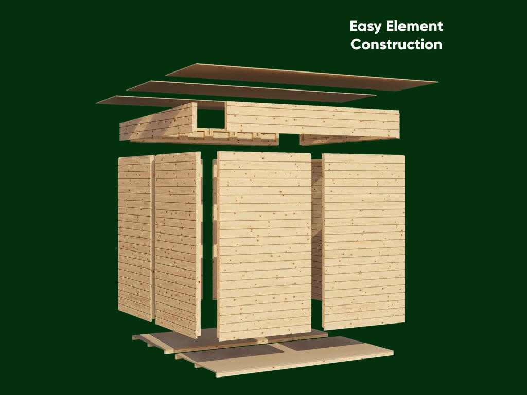 Lenn 2 – Cet abri de jardin avec toit monopente et dimensions pratiques offre une épaisseur de paroi de 19 mm et utilise une construction par éléments préfabriqués éprouvée. Construction complète par éléments préfabriqués incluant le plancher. Le toit peut être monté incliné vers l'avant, sur le côté ou vers l'arrière.