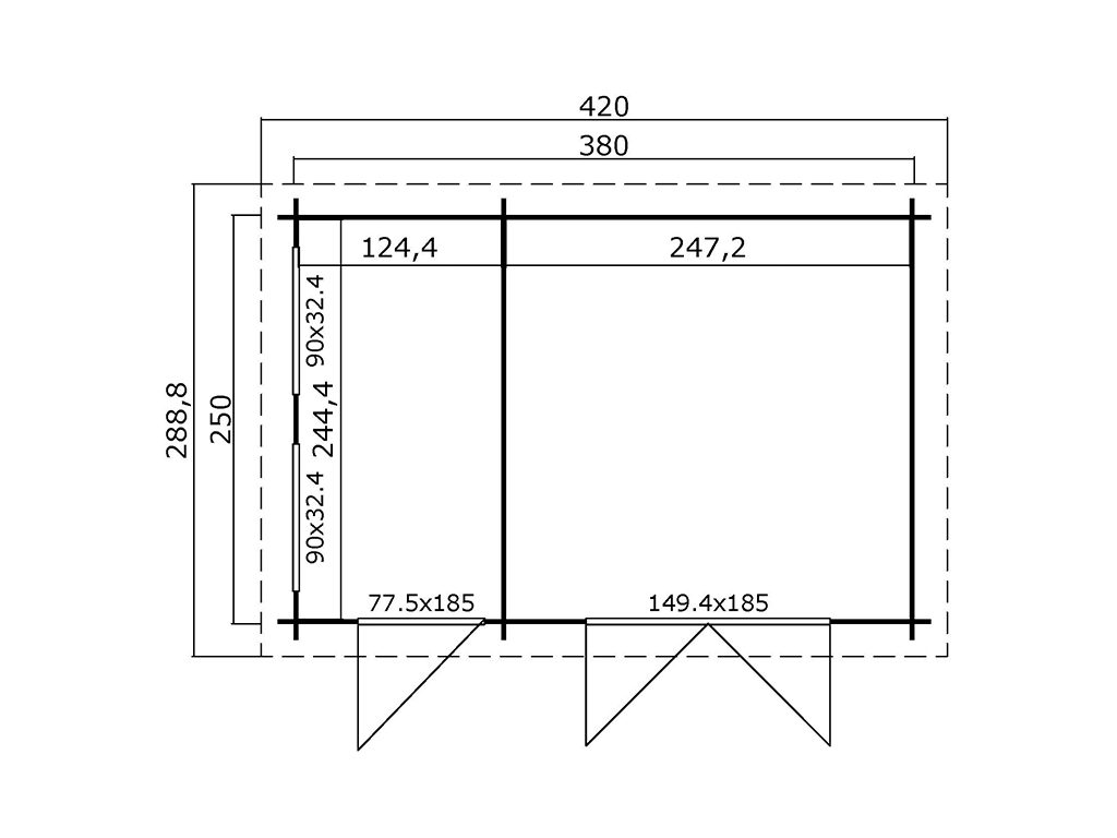 Dimensions extérieures avec débord de toit (l x P): 420 x 288,8 cm