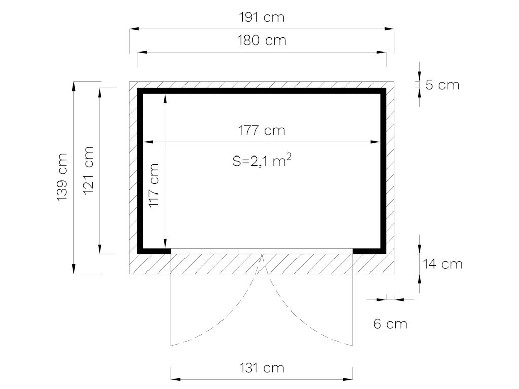 Dimensions L x P x H : 191 x 139 x 211 cm, dimensions de base : 180 x 121 cm, avec plancher.