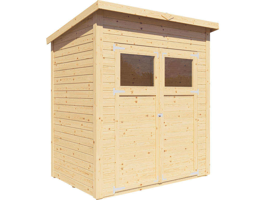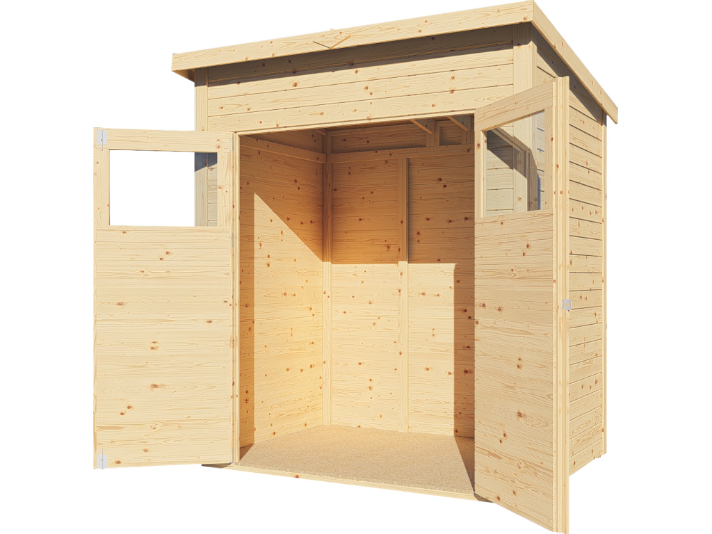 Un toit monopente moderne en bois massif avec un assemblage à rainures et languettes donne un aspect élégant et stylé à cet abri de jardin. Grâce à un seul pan de toit incliné, la surface d'utilisation à l'intérieur de l'abri de jardin est nettement moins limitée et la perte d'espace utile est minime. La pente du toit permet à l'eau de pluie de bien s'écouler et il n'est nécessaire de monter qu'une seule gouttière.