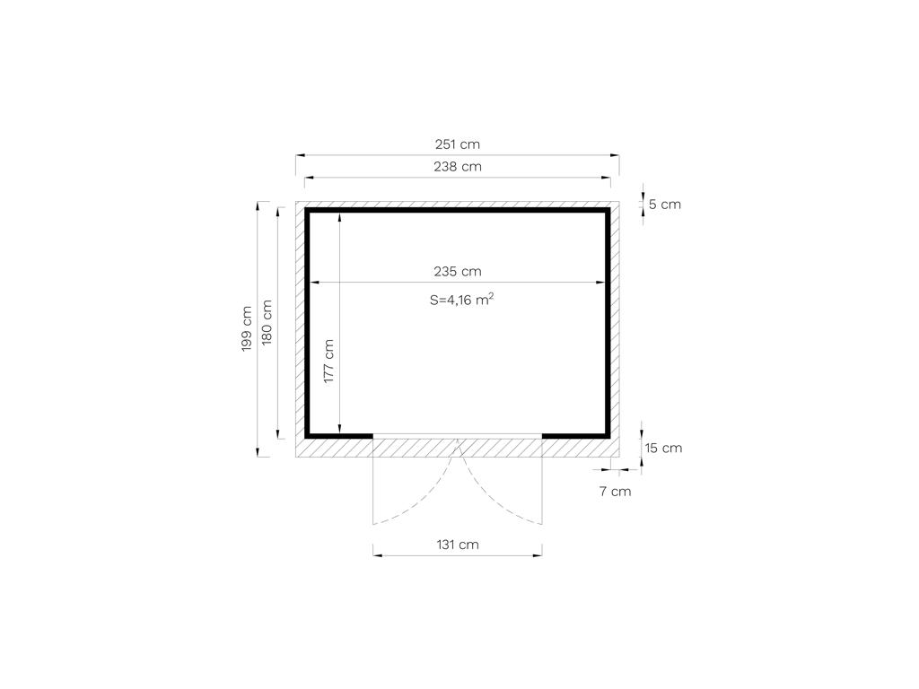 L x P x H : 251 x 199 x 210 cm, dimensions de base : 238 x 180 cm, avec plancher