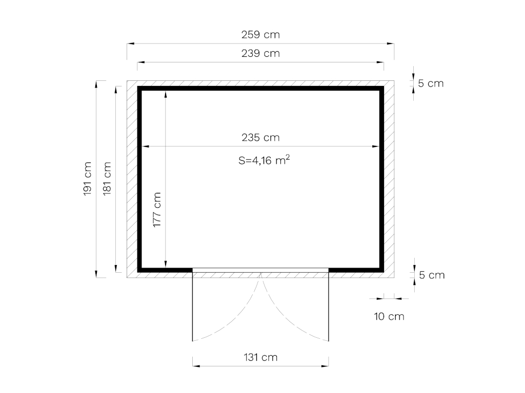 | Dimensions extérieures avec débord de toit (l x P): | 259 x 191 cm |
