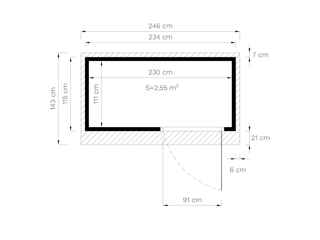 | Dimensions extérieures avec débord de toit (l x P): | 246 x 143 cm |