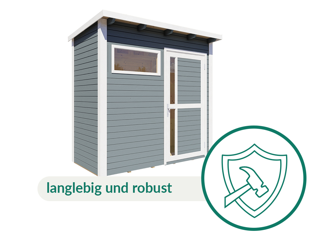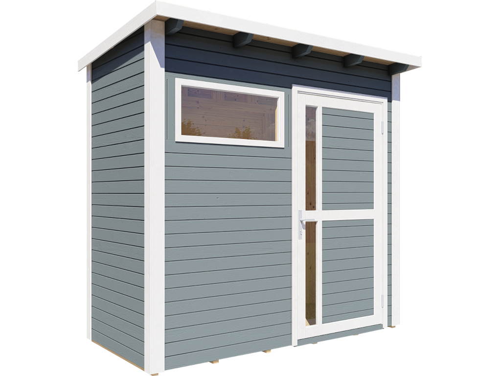 Un toit monopente moderne en bois massif avec un assemblage à rainures et languettes donne un aspect élégant et stylé à cet abri de jardin. Grâce à un seul pan de toit incliné, la surface dutilisation à lintérieur de labri de jardin est nettement moins limitée et la perte despace utile est minime. La pente du toit permet à leau de pluie de bien sécouler et il nest nécessaire de monter quune seule gouttière.