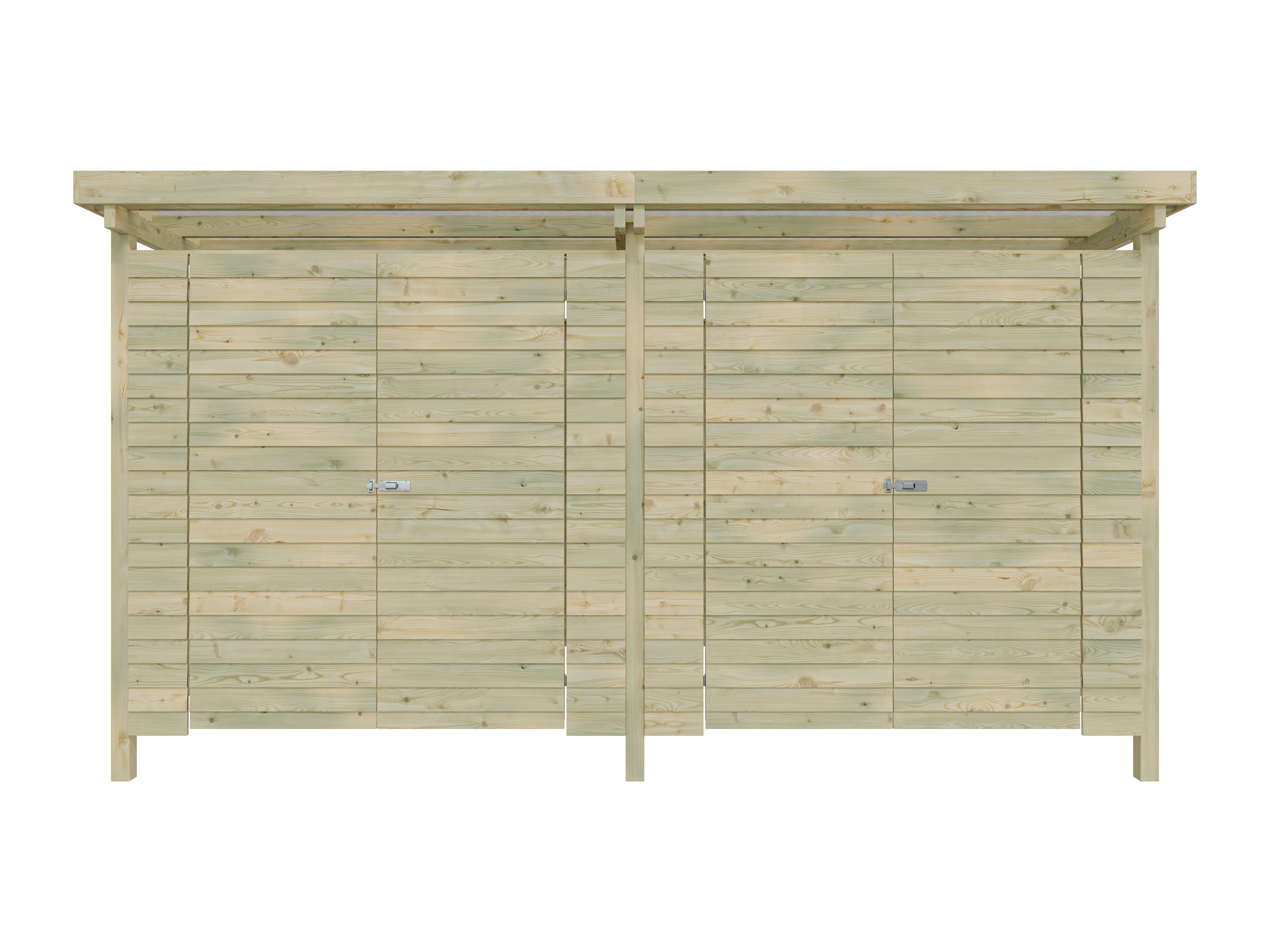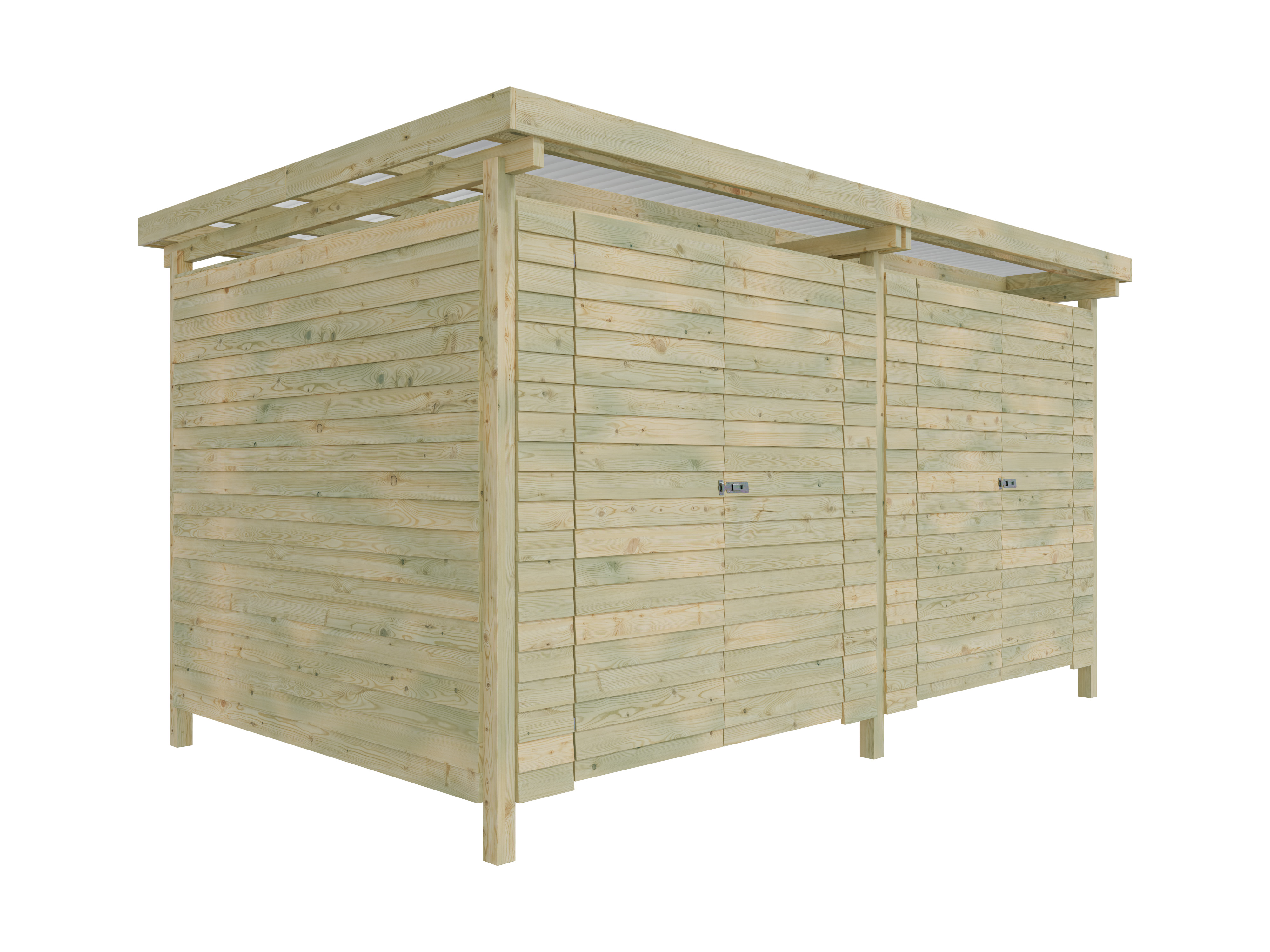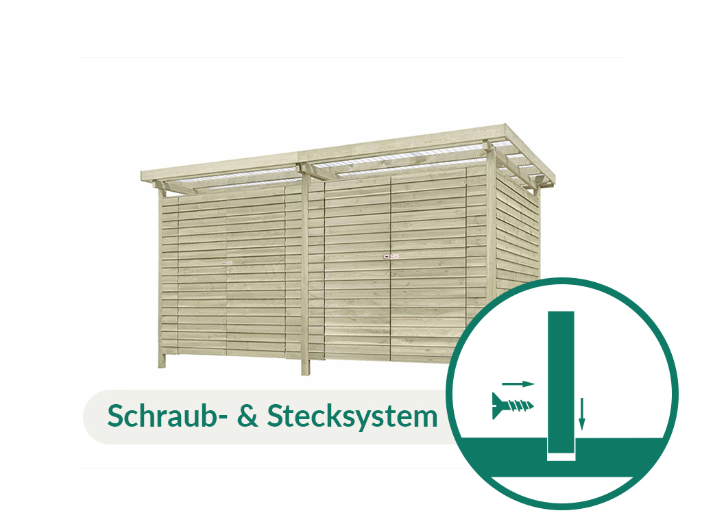 Les éléments de paroi prémontés sont livrés en coffrage à clin. Les planches de bois placées horizontalement, où chaque planche supérieure recouvre de quelques centimètres la planche située en dessous, offrent une protection particulière contre les intempéries. Les lamelles mesurent L 9 mm x P 110 mm et sont sciées proprement. Le toit est recouvert de plaques de toit transparentes en PVC en forme de vagues. Les poteaux robustes en bois croisé ont une épaisseur de 7 x 7 cm. - Portes doubles en bois massif
