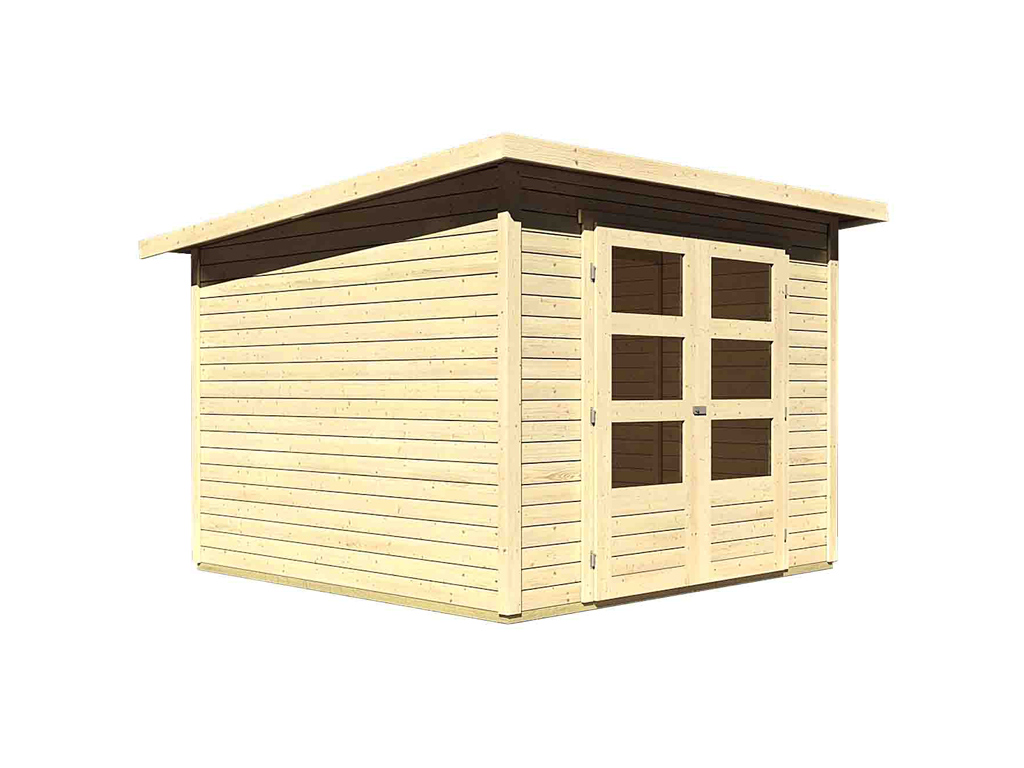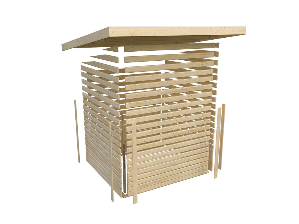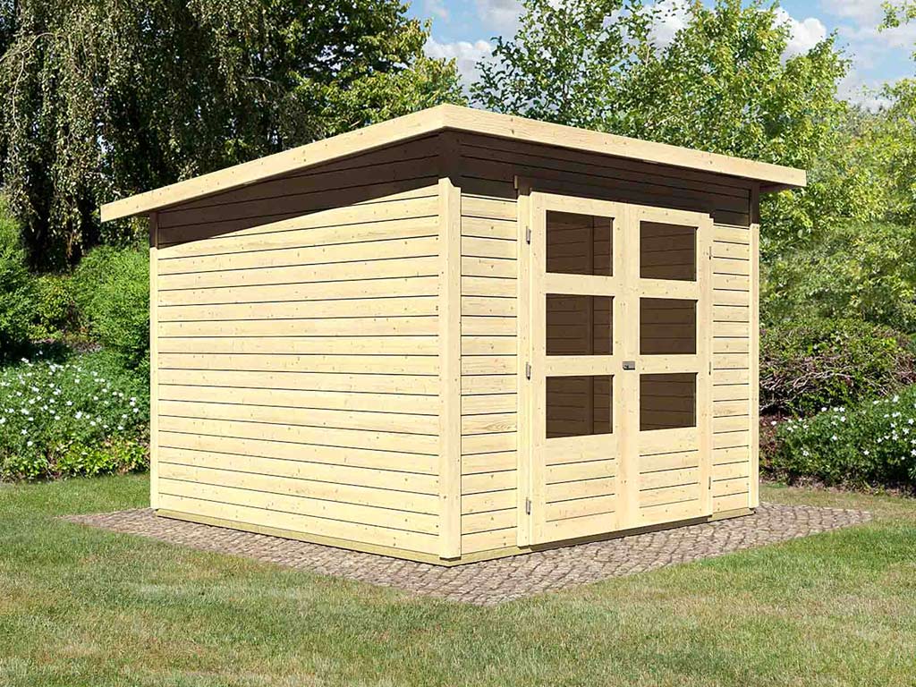 - Un toit moderne à deux pentes en bois massif avec assemblage à rainures et languettes confère à votre abri de jardin un aspect élégant et stylé. Avec un seul pan de toit incliné, la surface d'utilisation à l'intérieur de l'abri de jardin est nettement moins limitée et la perte d'espace utile est minime. De plus, le côté incliné du toit à une pente permet à l'eau de pluie de s'écouler facilement et ne nécessite que l'installation d'une seule gouttière.