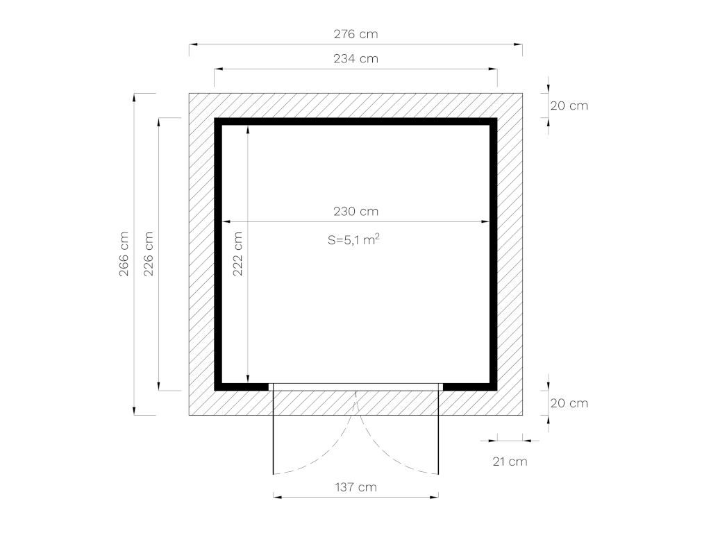 | Dimensions extérieures avec débord de toit (l x P): | 276 x 266 cm |