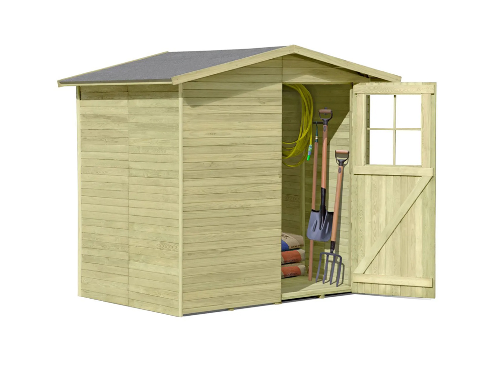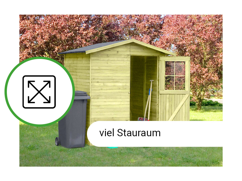 Grâce à la porte simple (L 71 x H 175,5 cm) avec fenêtre en plastique, vous conservez suffisamment d’espace pour stocker des objets encombrants. - Avec plancher et carton bitumé pour le toit