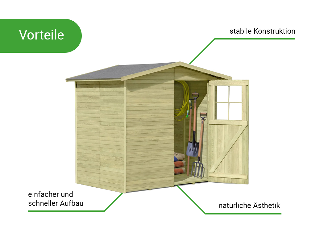 Grâce à la porte simple (L 71 x H 175,5 cm) avec fenêtre en plastique, vous conservez suffisamment d’espace pour stocker des objets encombrants. - Avec plancher et carton bitumé pour le toit