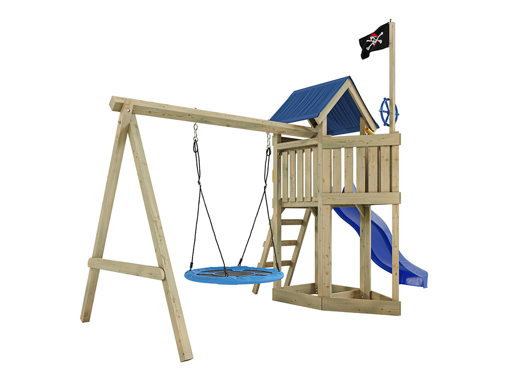 Aire de jeu Captain Jolly en bois autoclave avec portique et 2 balançoires, toboggan bleu + balançoi