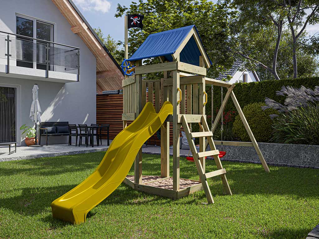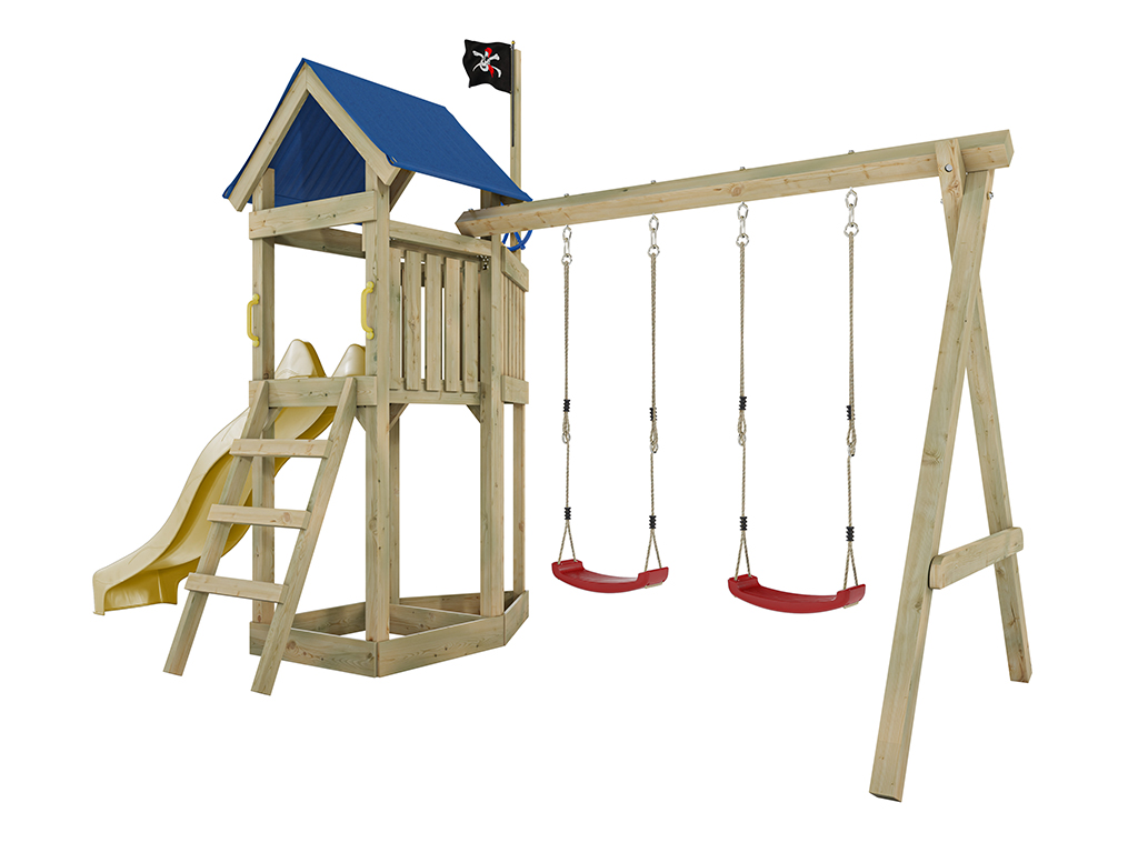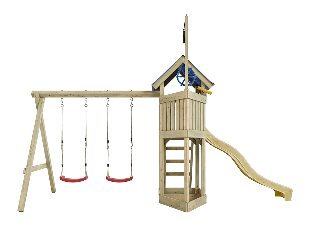 Aire de jeu Captain Jolly en bois autoclave avec portique et 2 balançoires, toboggan jaune + sièges