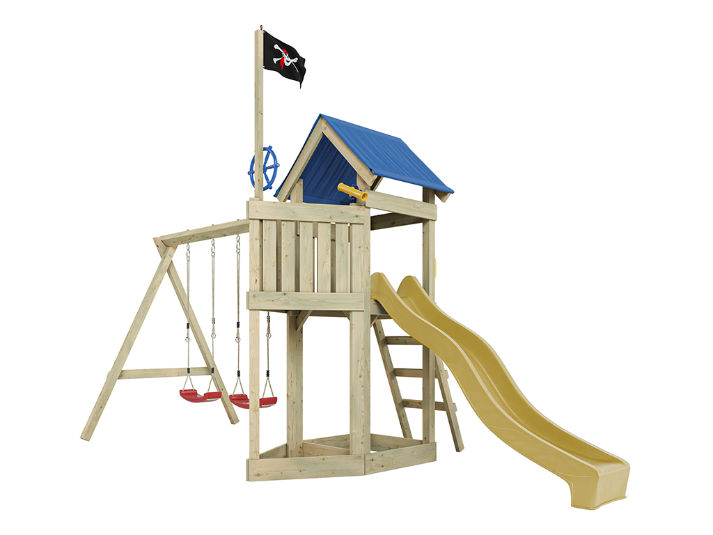- Aire de jeu Captain Jolly en bois autoclave, toit en bâche, extension de plateforme, 2 poignées, bac à sable, échelle, 1x télescope, 1x volant, 1x drapeau de pirate, 1x toboggan