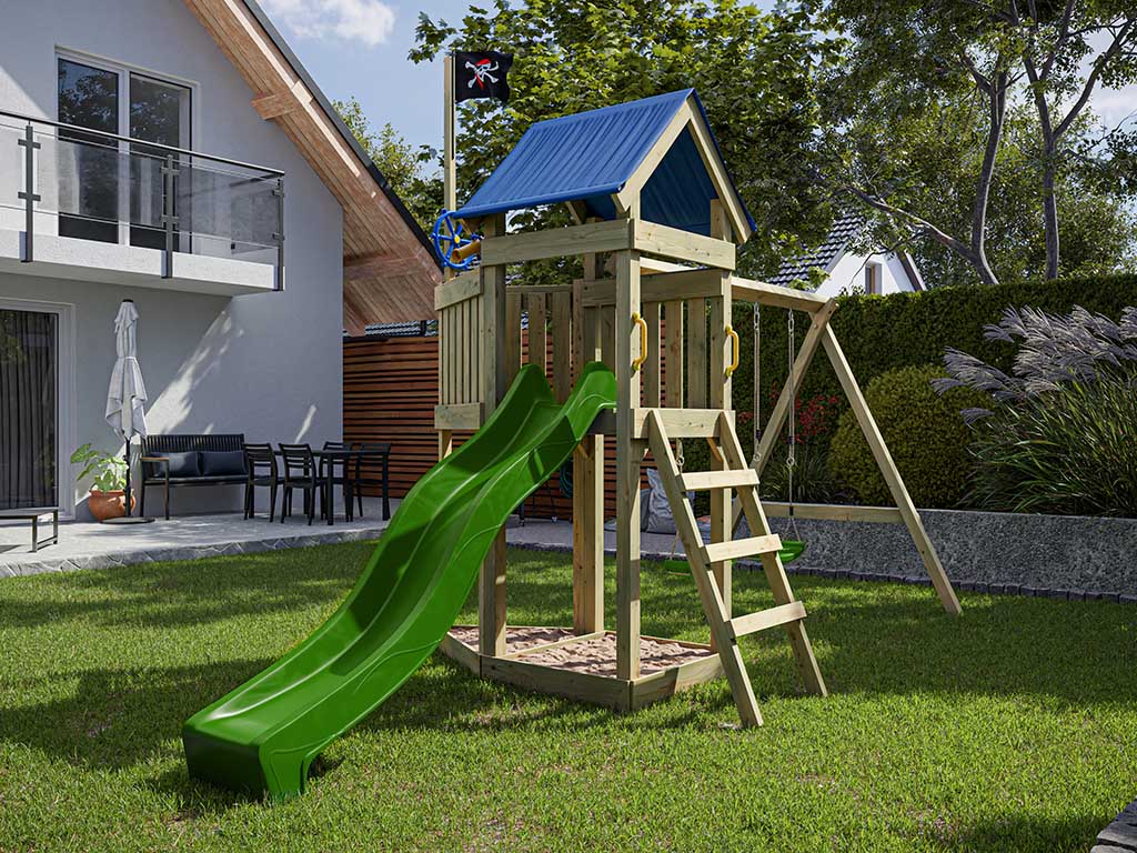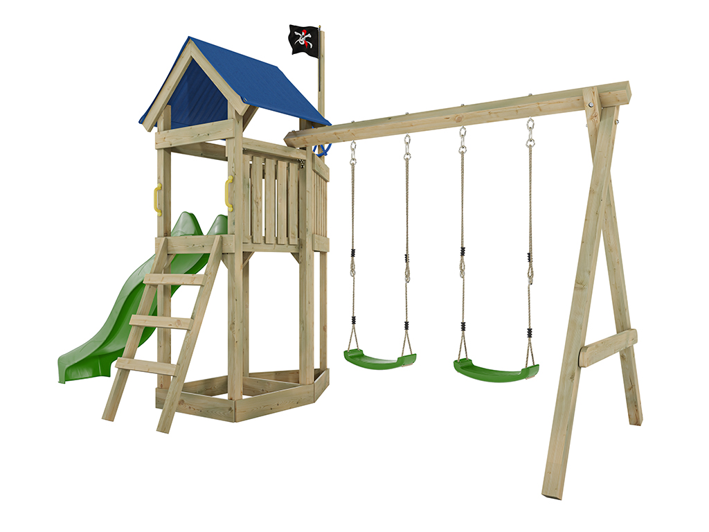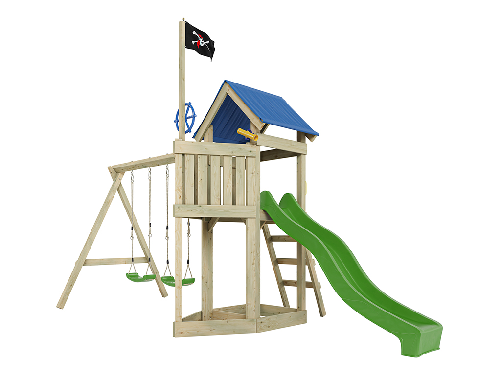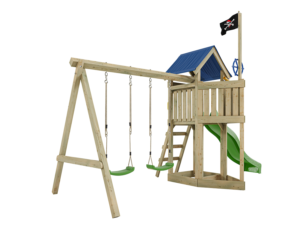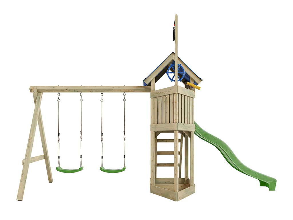 Aire de jeu Captain Jolly en bois autoclave avec portique et 2 balançoires, toboggan vert + sièges v
