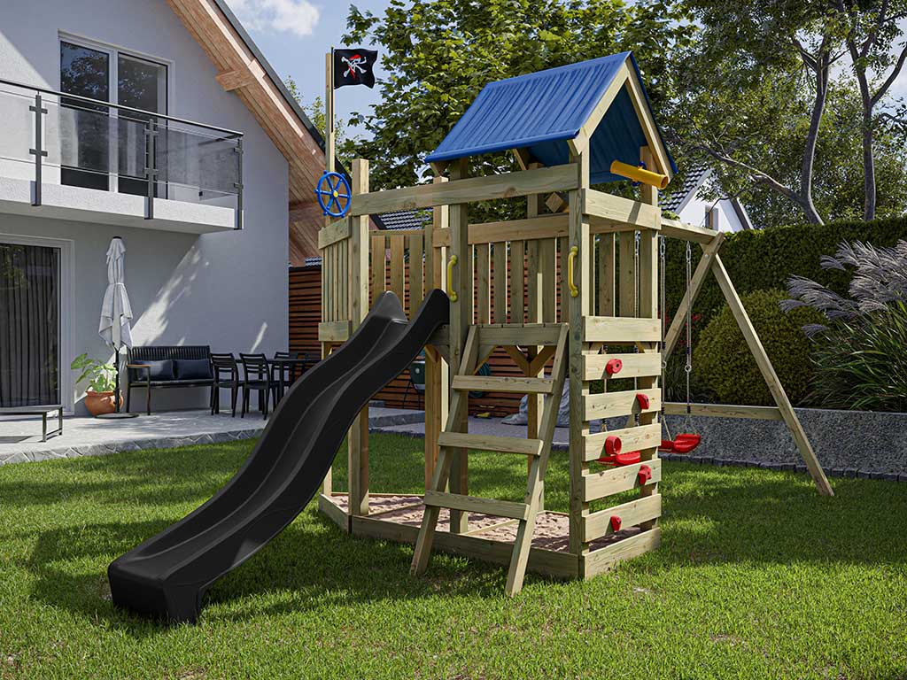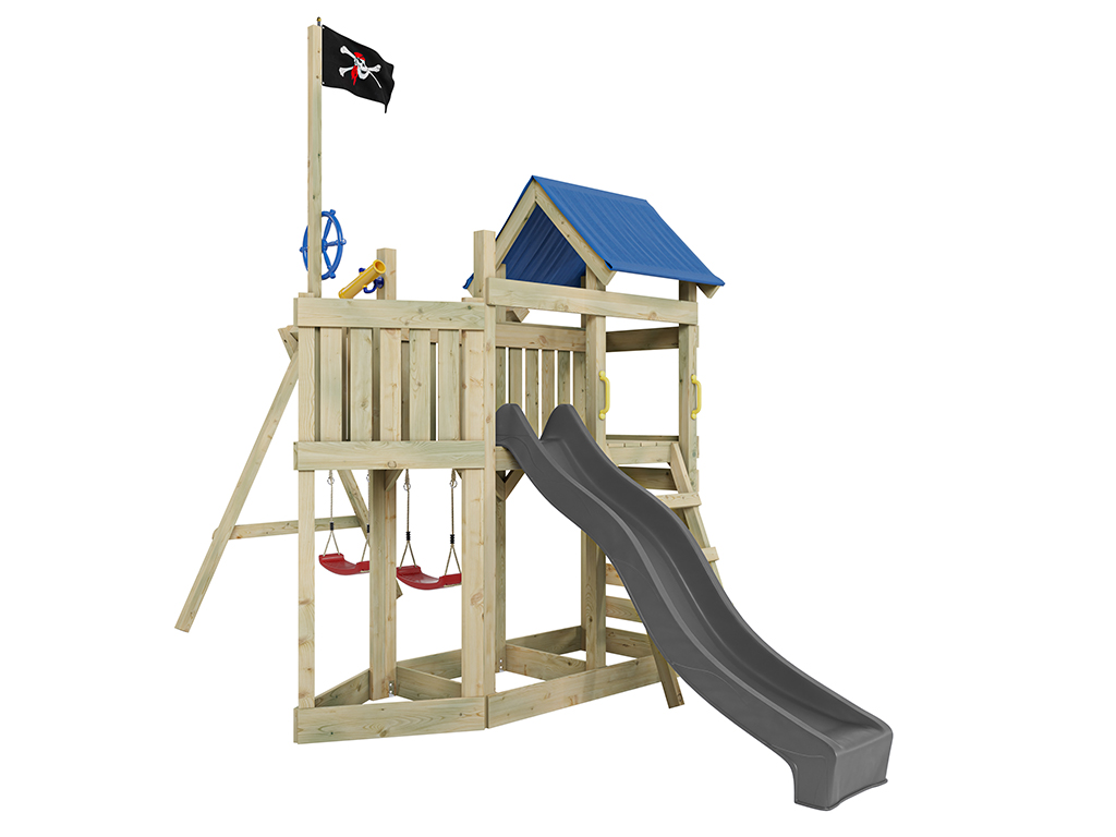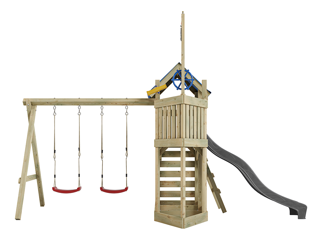 Aire de jeu Captain Snappy en bois autoclave avec portique et 2 balançoires, toboggan gris + sièges