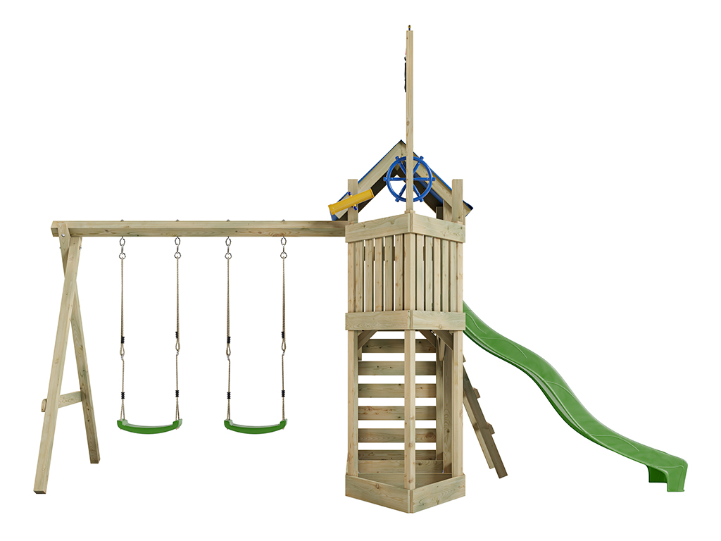Aire de jeu Captain Snappy en bois autoclave avec portique et 2 balançoires, toboggan + sièges bleus