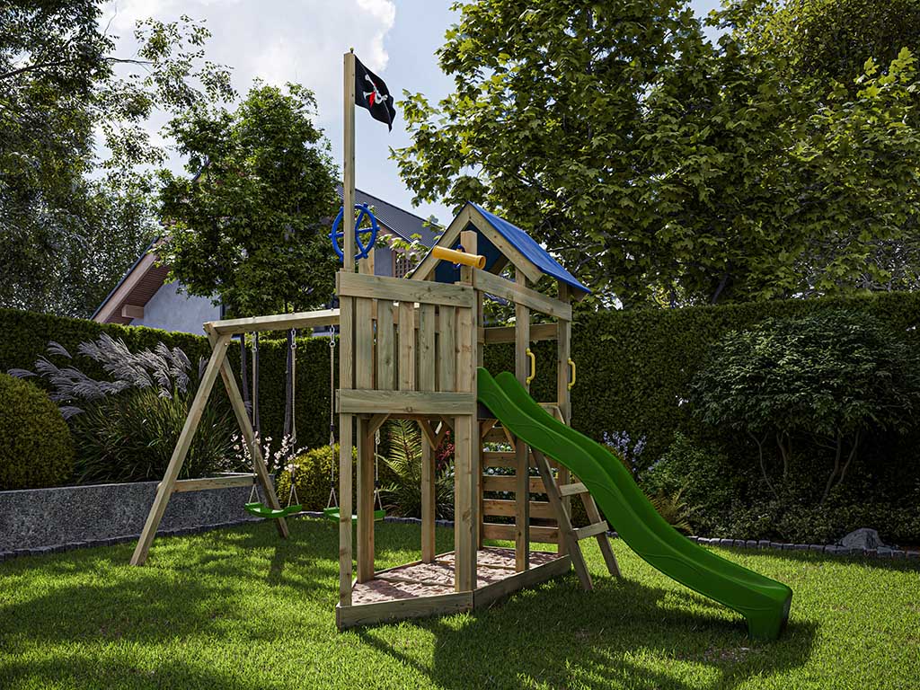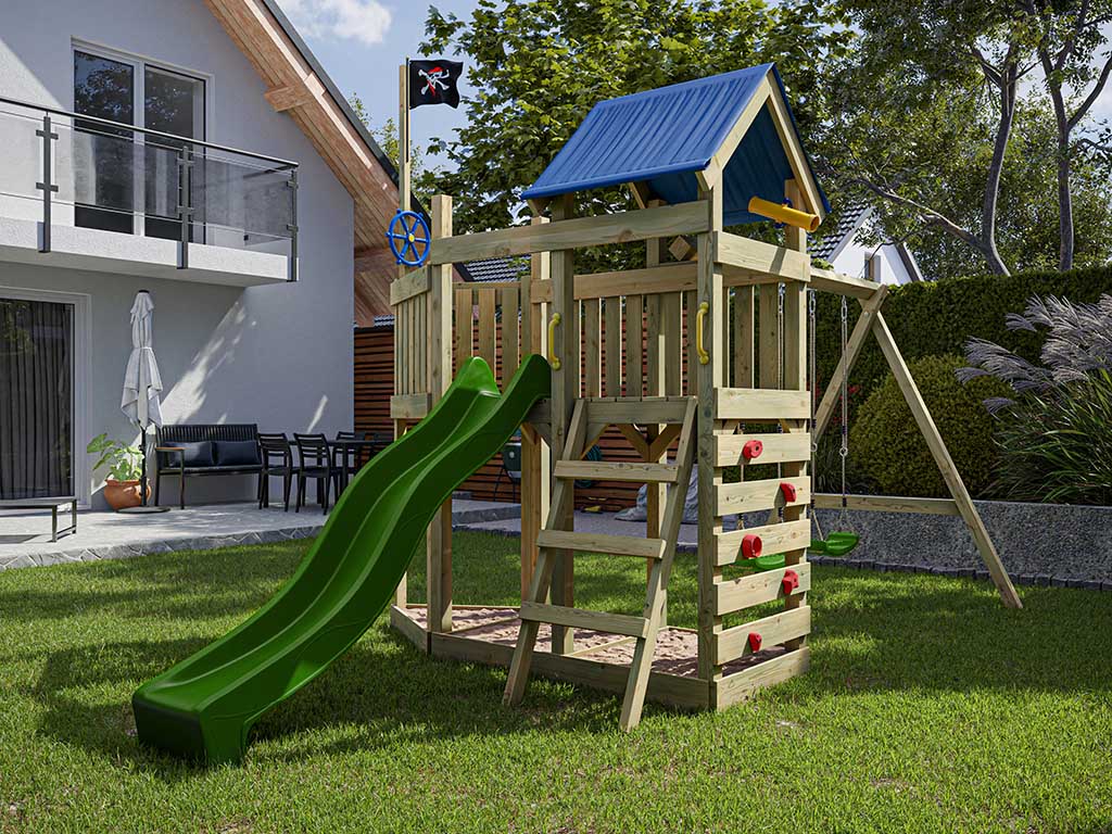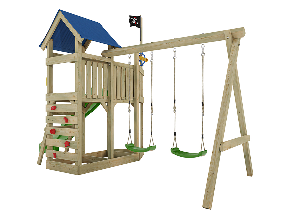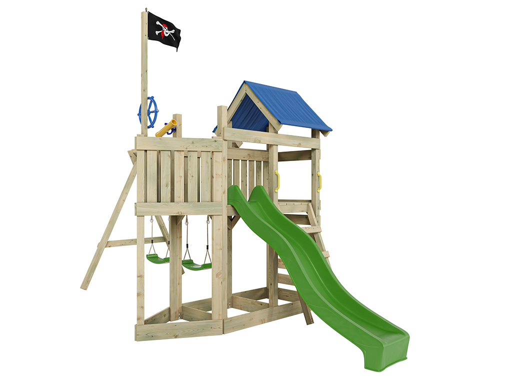 Aire de jeu Captain Snappy en bois autoclave avec portique et 2 balançoires, toboggan + sièges bleus