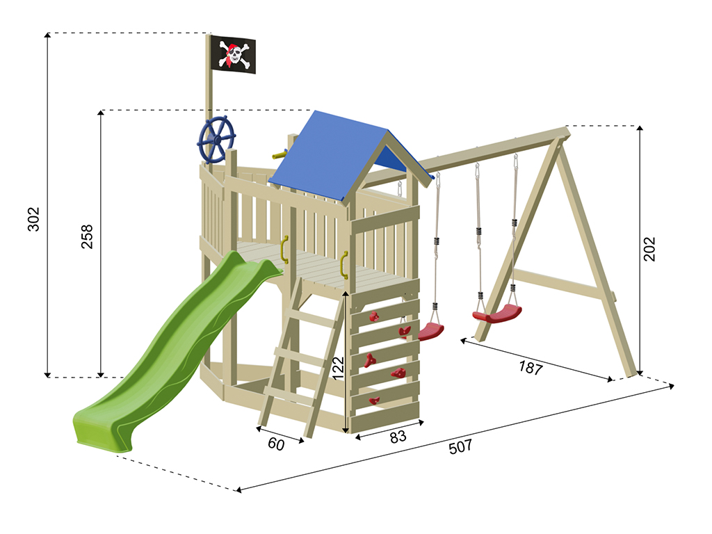 Cette aire de jeu, ornée d'un pavillon Captain Snappy, fera le bonheur des petits corsaires et des grands pirates. Ce pavillon est le symbole reconnu de tous les pirates. Reconnaissable de loin, il fait fera la fierté de vos petits pirates. Le grand navire, mesurant 507 x 205 x 258 cm, offre un toit pour se protéger des mers agitées et découvrir des îles inconnues même par temps de tempête. La plateforme d'observation est placée à une hauteur de 122 cm. Pour se jeter dans l'aventure, rien de tel qu'une glissade sur le toboggan bleu situé à bâbord (à gauche). Et pour reprendre rapidement la mer, il y a un mur d'escalade à l'arrière du navire ainsi qu'une échelle à tribord. Si d'autres pirates apparaissent en haute mer, le navire est équipé d'un portique avec deux balançoires pour se rendre rapidement sur l'autre navire.
