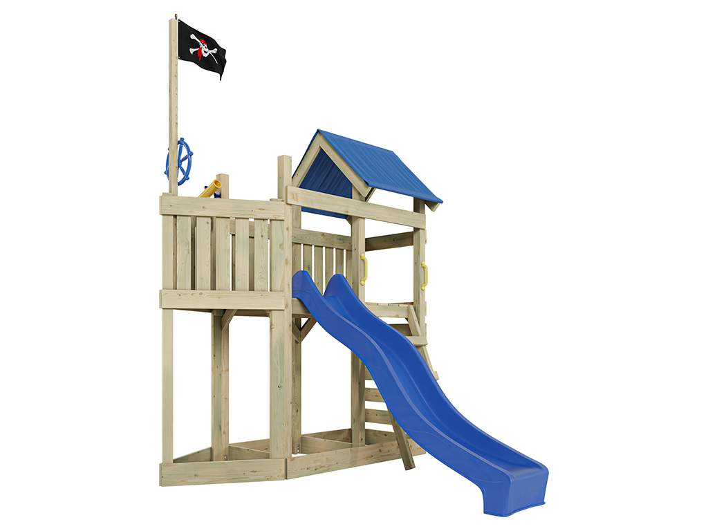 Cette aire de jeu, ornée d'un pavillon Captain Jolly, fera le bonheur des petits corsaires et des grands pirates. Ce pavillon est le symbole reconnu de tous les pirates. Reconnaissable de loin, il fait fera la fierté de vos petits pirates. Le grand navire, mesurant 275 x 229 x 258 cm, offre un toit pour se protéger des mers agitées et découvrir des îles inconnues même par temps de tempête. La plateforme d'observation est placée à une hauteur de 122 cm. Pour se jeter dans l'aventure, rien de tel qu'une glissade sur le toboggan bleu situé à bâbord (à gauche). Et pour reprendre rapidement la mer, il y a un mur d'escalade à l'arrière du navire ainsi qu'une échelle à tribord.
