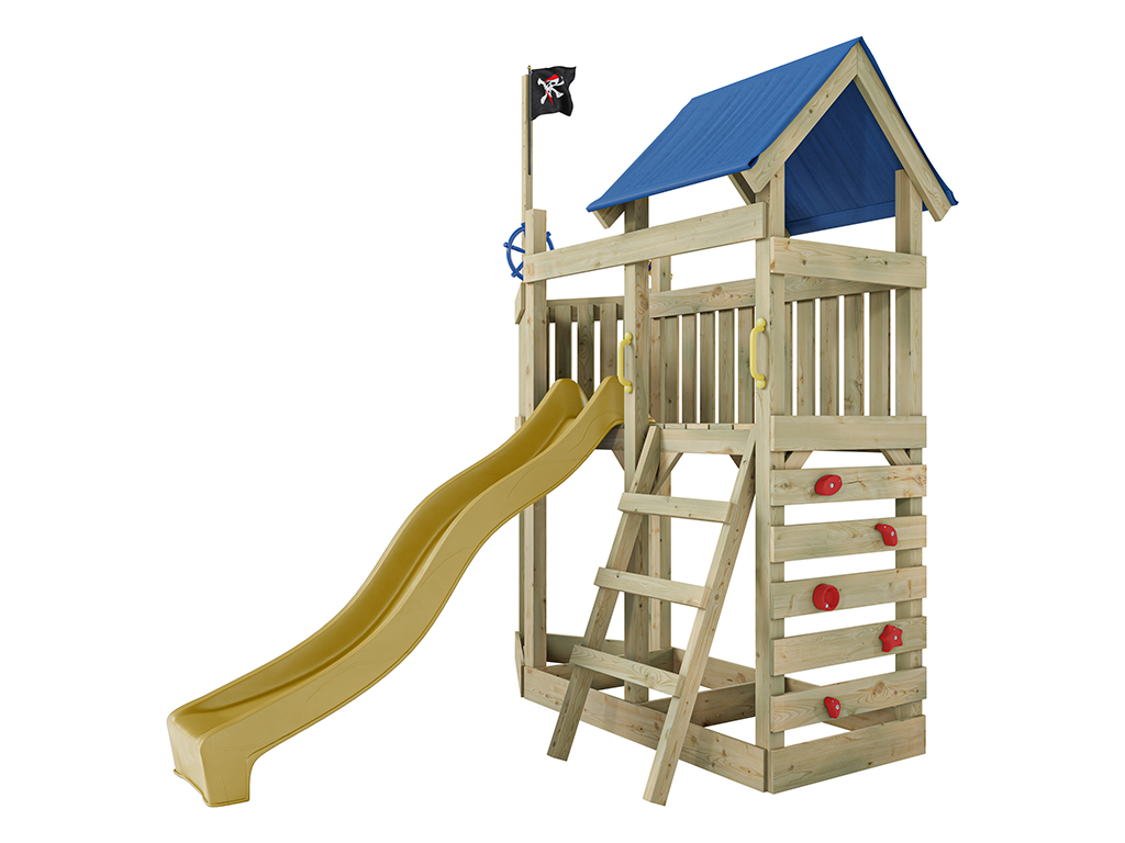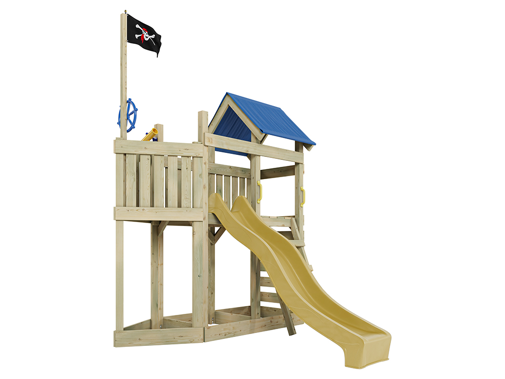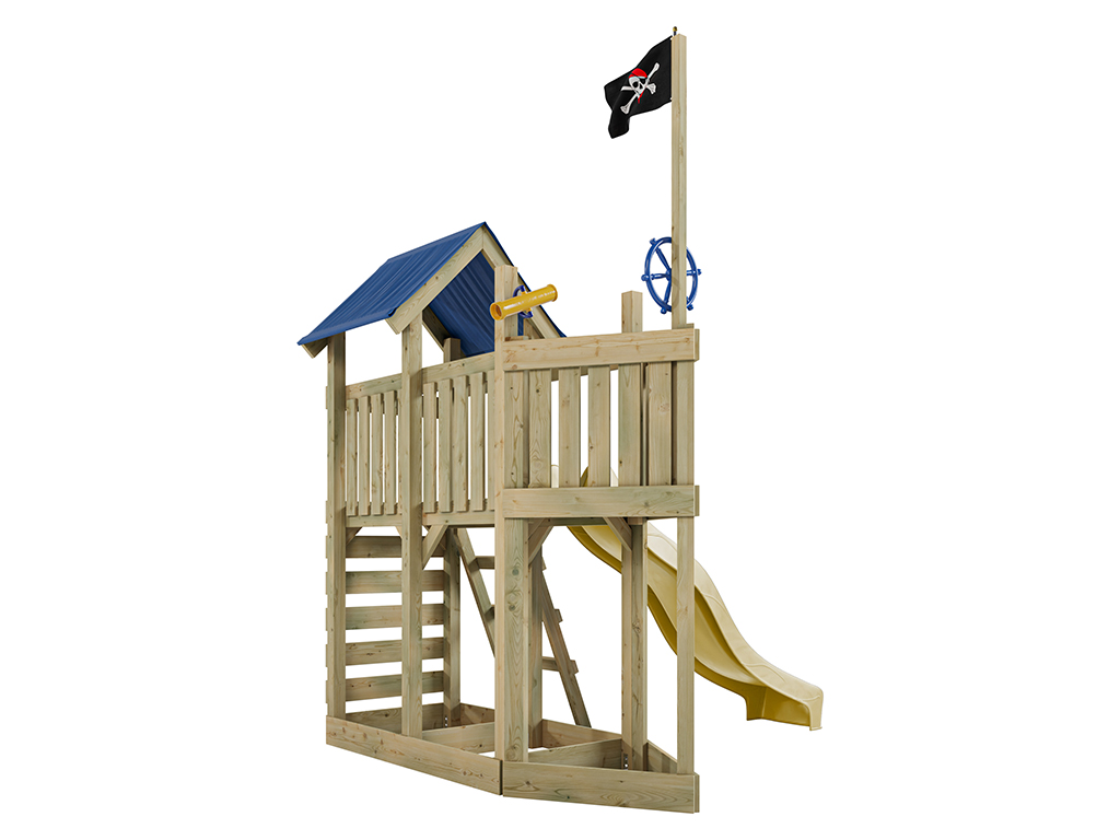 Cette aire de jeu, ornée d'un pavillon Captain Snappy, fera le bonheur des petits corsaires et des grands pirates. Ce pavillon est le symbole reconnu de tous les pirates. Reconnaissable de loin, il fait fera la fierté de vos petits pirates. Le grand navire, mesurant 275 x 229 x 258 cm, offre un toit pour se protéger des mers agitées et découvrir des îles inconnues même par temps de tempête. La plateforme d'observation est placée à une hauteur de 122 cm. Pour se jeter dans l'aventure, rien de tel qu'une glissade sur le toboggan jaune situé à bâbord (à gauche). Et pour reprendre rapidement la mer, il y a un mur d'escalade à l'arrière du navire ainsi qu'une échelle à tribord.