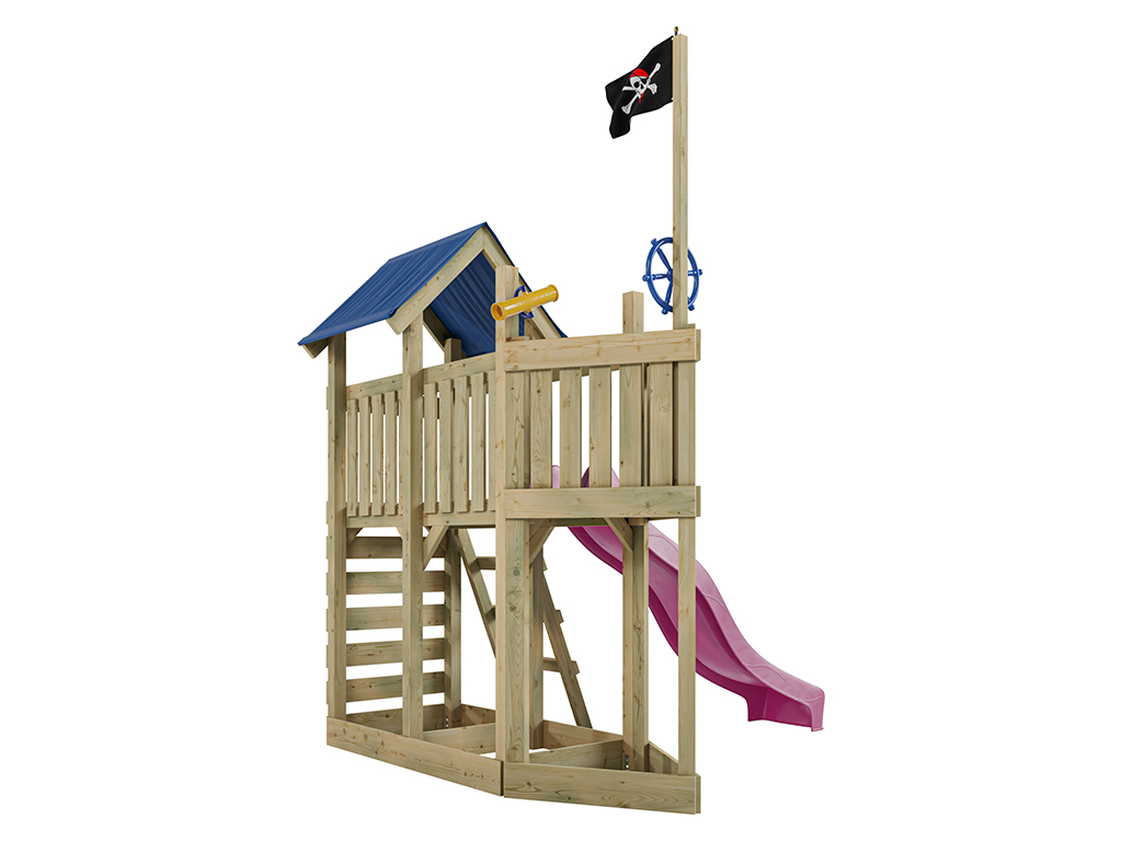 Cette aire de jeu, ornée d'un pavillon Captain Snappy, fera le bonheur des petits corsaires et des grands pirates. Ce pavillon est le symbole reconnu de tous les pirates. Reconnaissable de loin, il fait fera la fierté de vos petits pirates. Le grand navire, mesurant 275 x 229 x 258 cm, offre un toit pour se protéger des mers agitées et découvrir des îles inconnues même par temps de tempête. La plateforme d'observation est placée à une hauteur de 122 cm. Pour se jeter dans l'aventure, rien de tel qu'une glissade sur le toboggan rose situé à bâbord (à gauche). Et pour reprendre rapidement la mer, il y a un mur d'escalade à l'arrière du navire ainsi qu'une échelle à tribord.