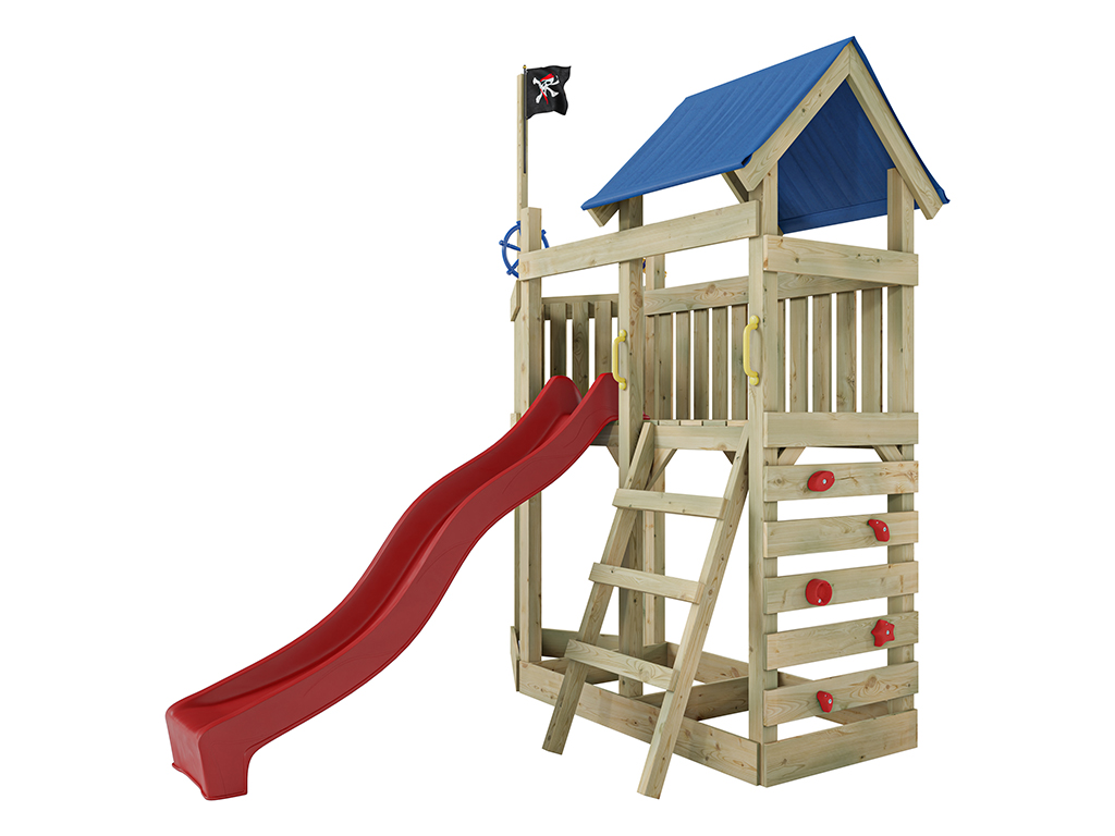 Matériau : Bois, L x P x H : 275 x 229 x 258 cm, avec mur d'escalade, accessoires et toboggan rouge
