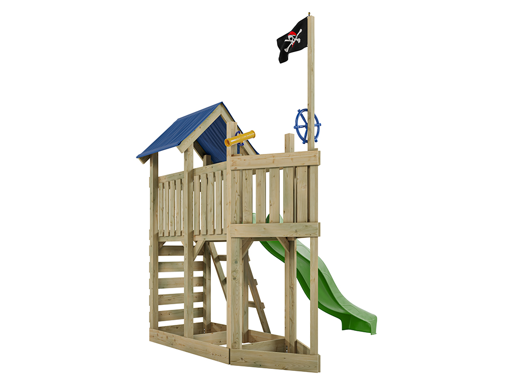 - Aire de jeu Captain Snappy en bois autoclave, toit en bâche, extension de plateforme, 2 poignées, bac à sable, échelle, 1x télescope, 1x volant, 1x toboggan