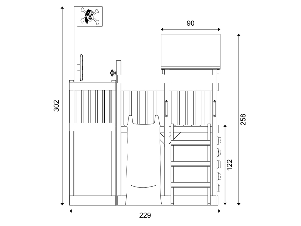 Cette aire de jeu, ornée d'un pavillon Captain Snappy, fera le bonheur des petits corsaires et des grands pirates. Ce pavillon est le symbole reconnu de tous les pirates. Reconnaissable de loin, il fait fera la fierté de vos petits pirates. Le grand navire, mesurant 275 x 229 x 258 cm, offre un toit pour se protéger des mers agitées et découvrir des îles inconnues même par temps de tempête. La plateforme d'observation est placée à une hauteur de 122 cm. Pour se jeter dans l'aventure, rien de tel qu'une glissade sur le toboggan vert situé à bâbord (à gauche). Et pour reprendre rapidement la mer, il y a un mur d'escalade à l'arrière du navire ainsi qu'une échelle à tribord.