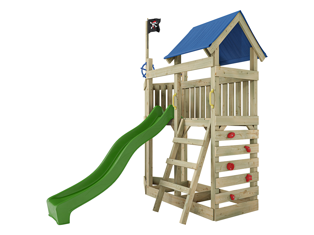 Matériau : Bois, L x P x H : 275 x 229 x 258 cm, avec mur d'escalade, accessoires et toboggan vert